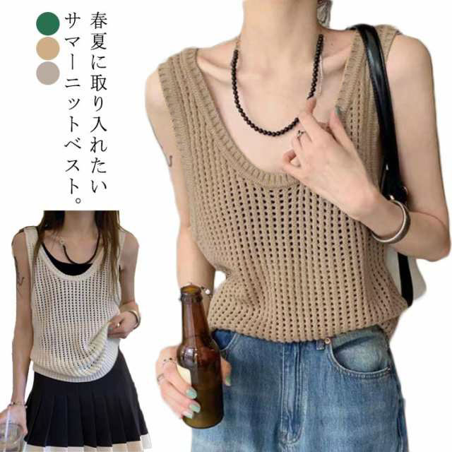 女性らしい透け感が涼しげなサマーニットベスト タンクトップ 無地 2023春新作 ジレ 涼しいレディースファッション トップス タンクトップ
