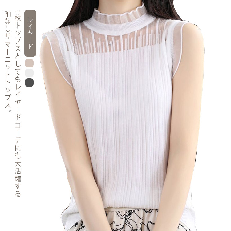 どんな服にも合わせやすい♪ フリル 立ち襟 サマーニットトップス 袖なし キャミソール 透け感 シースルーレース