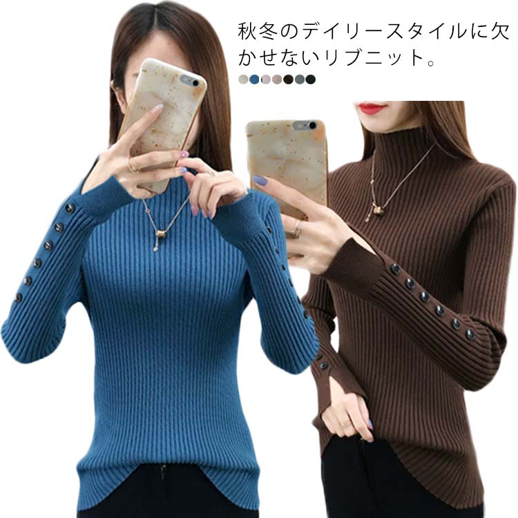 袖ボタン 秋冬 ニット トップス 長袖 タートルネック セーター ハイネック レディース ボタンアレンジ レディース