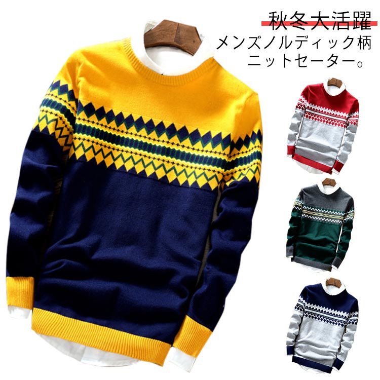 ノルディック ニット メンズ プルオーバー ニットセーター セーター 丸首 クルーネック 求心柄メンズファッション トップス ニット セーター
