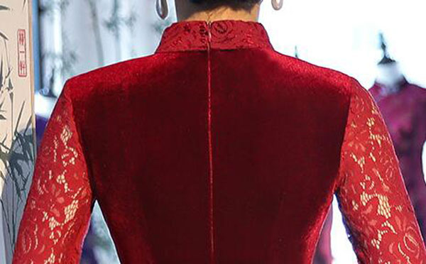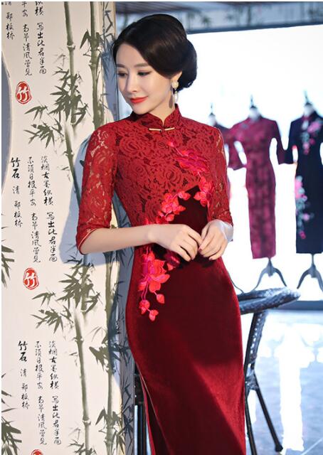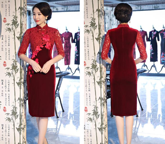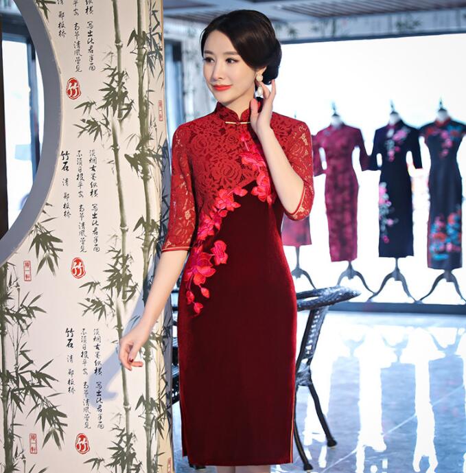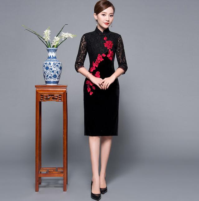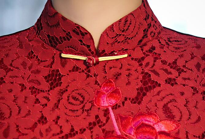 花柄刺繍 袖総レース 膝丈 チャイナド