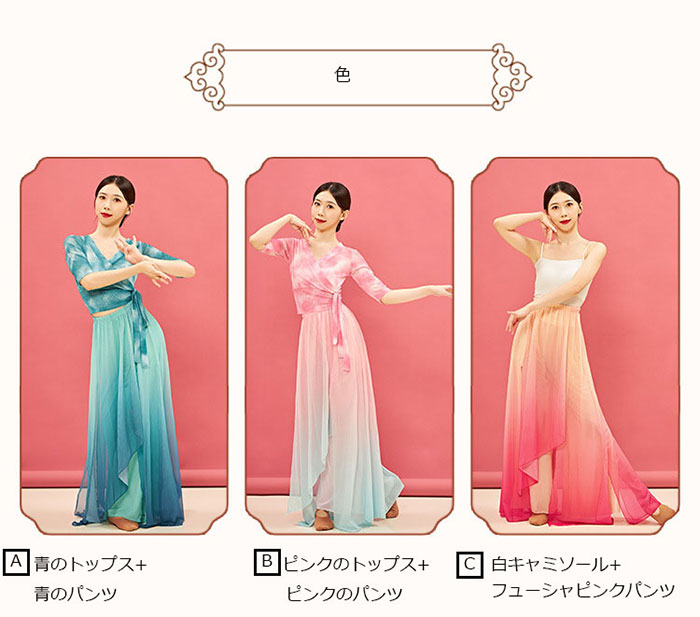 horizontal-key: A-青のセットアップ B-ピンクのセットアップ C-キャミソールのセットアップ