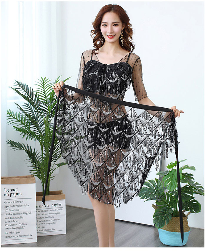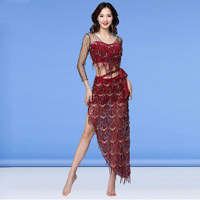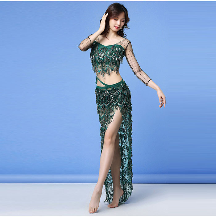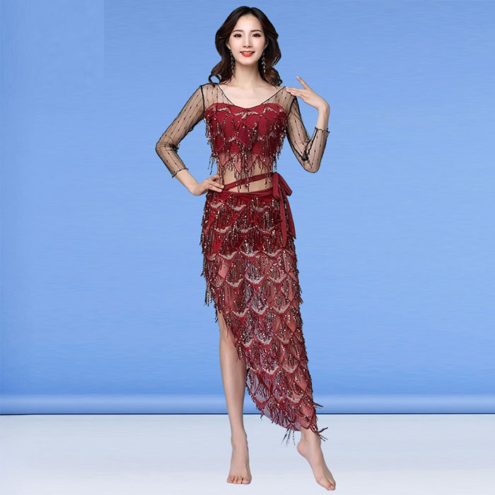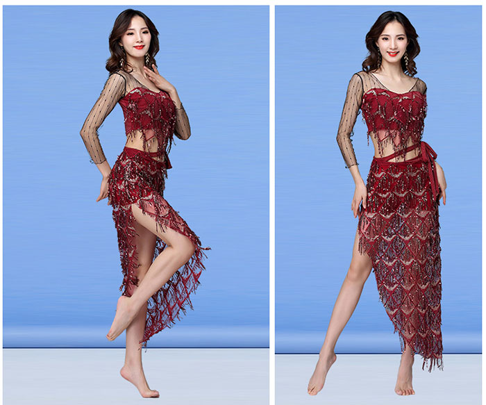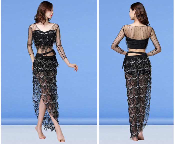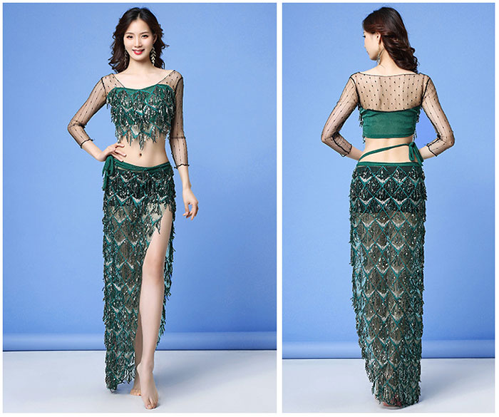 ベリーダンス 衣装 スパンコール キラキラ おしゃれ 発表会 衣装 メッシュ生地 透け感 セクシー ベリーダンス衣装 伸縮性生地 長袖 トップス マーメイド ヒップスカーフスカート ロング丈 ベリーダ