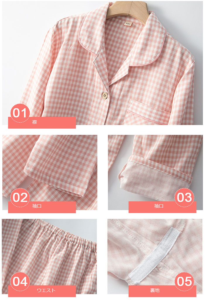 キッズ パジャマ 女の子 半袖 長袖 綿100% ガーゼ ルームウェア 110cm 120cm 130cm 140cm 150cm 160cm 春夏 夏 子供 チェック柄 かわいい おしゃれ 涼しい