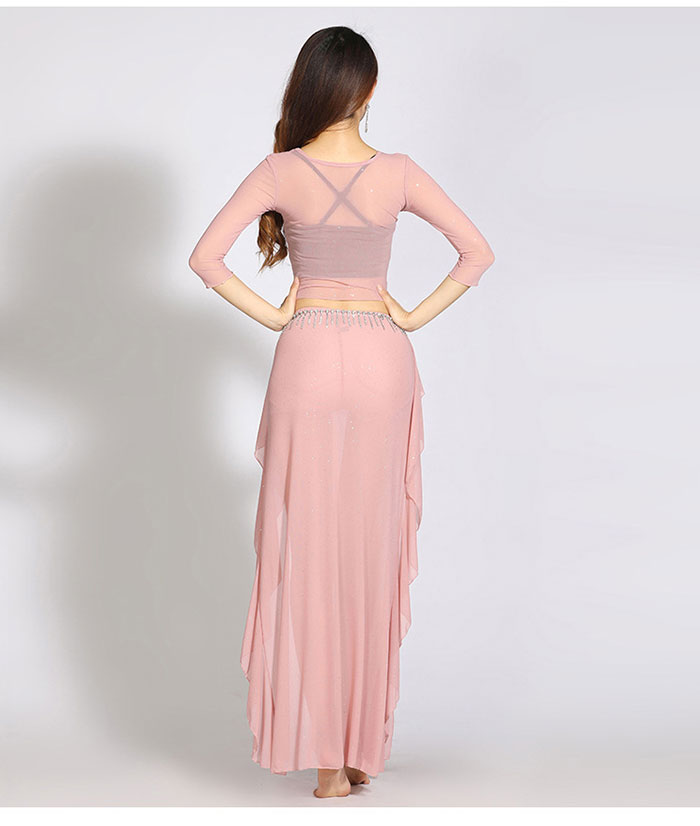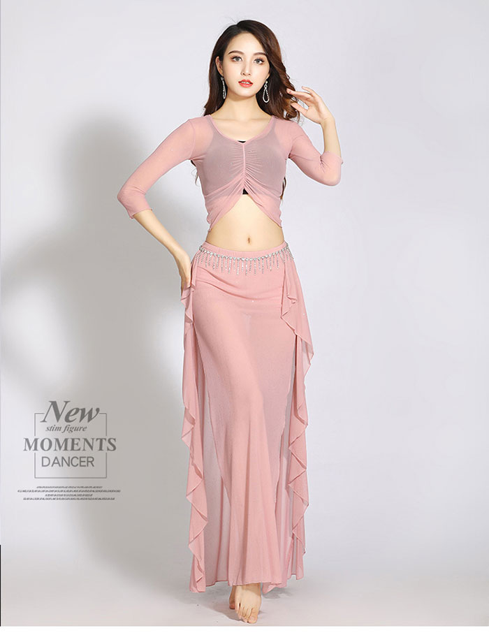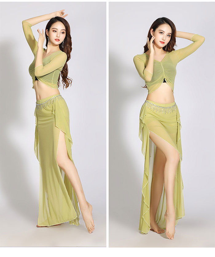 ベリーダンス 衣装 セットアップ レッスン着 可愛い 花柄 ストレッチメッシュ 長袖 Vネック へそ出し ショット丈 トップス スリット オーバー スカート ロング丈 おしゃれ ダンス衣装 ステージ衣