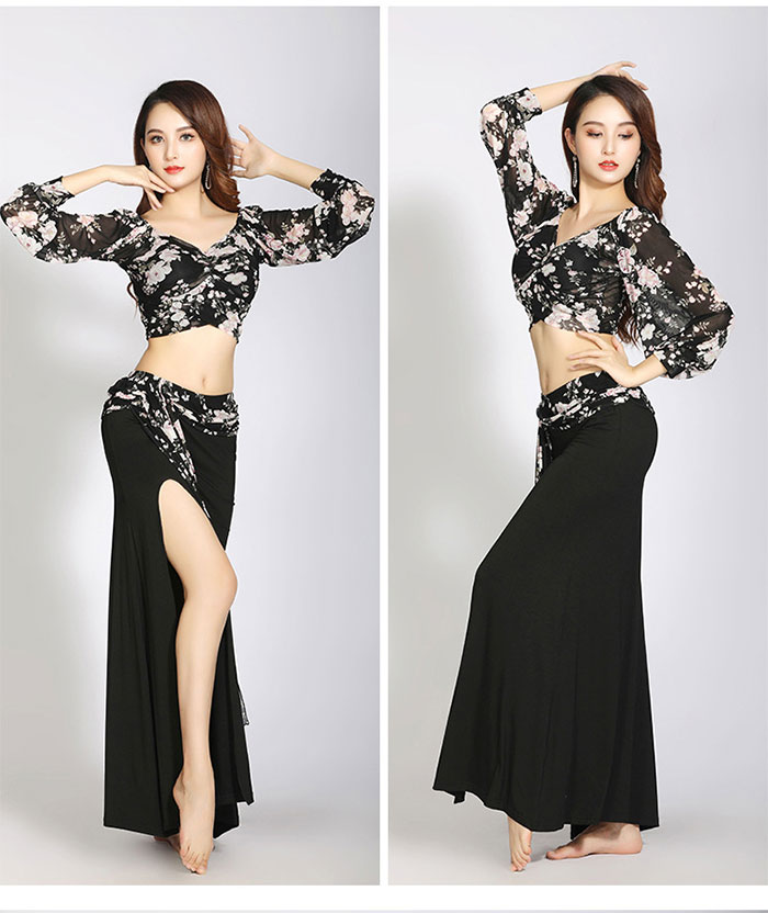 ベリーダンス 衣装 セットアップ レッスン着 可愛い パープル 紫 花柄 ストレッチメッシュ 長袖 Vネック へそ出し ショット丈 トップス スリット オーバー スカート ロング丈 おしゃれ ダンス衣