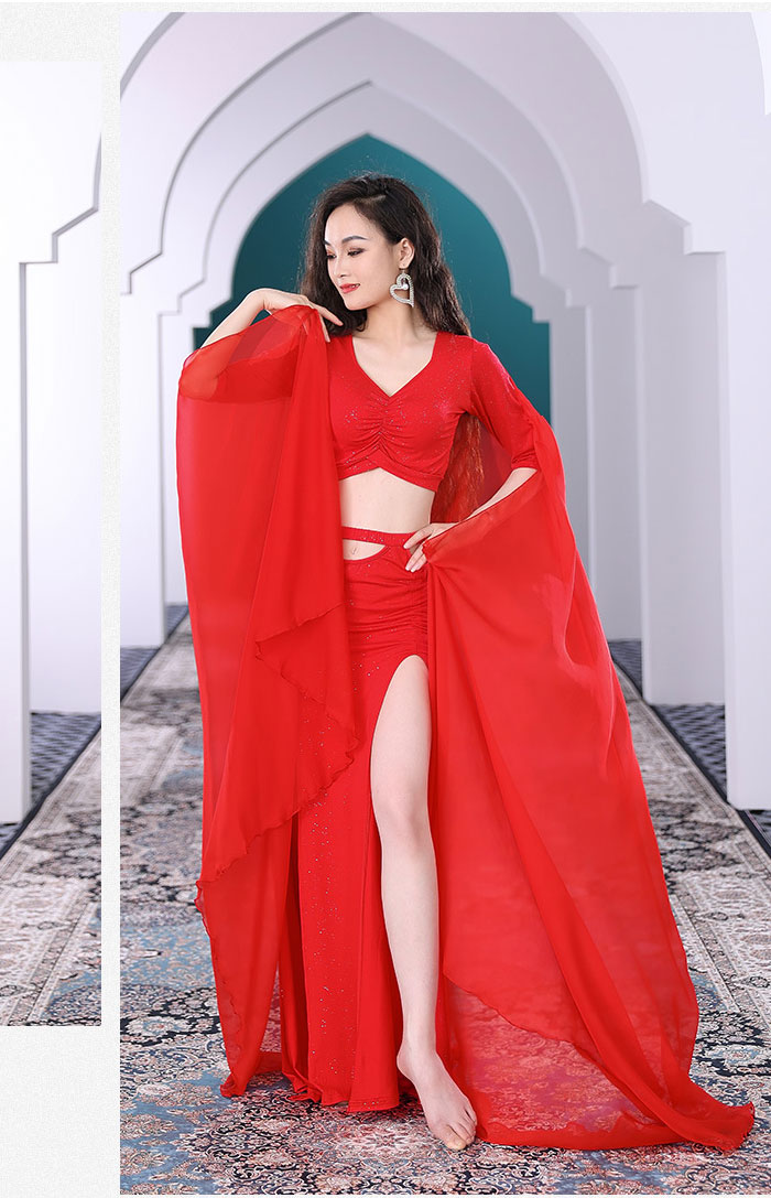 ベリーダンス衣装 セットアップ 華やか 目を引く おしゃれ ベリーダンス 衣装 ストレッチ Vネック 5分袖 スリットオーバー スカート ロング丈 星屑 キラキラ ダンス 舞台衣装 ステージ衣装 ダン