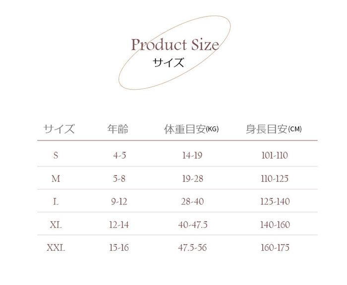Key0: S(101-110cm) M(110-125cm) L(125-140cm) XL(140-160cm) 2XL(160-175cm)