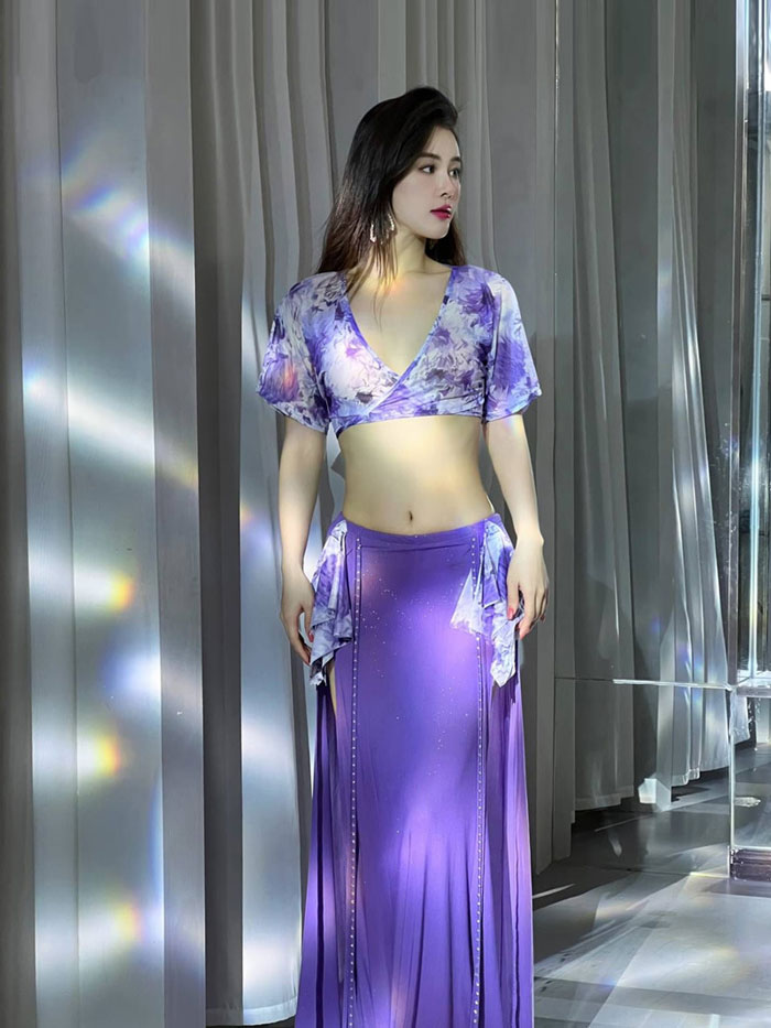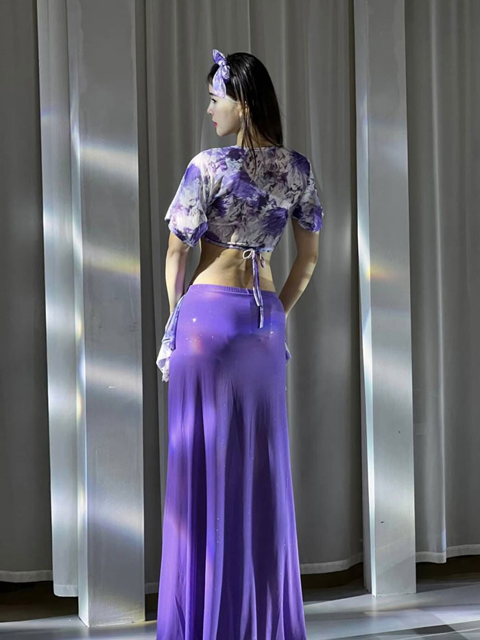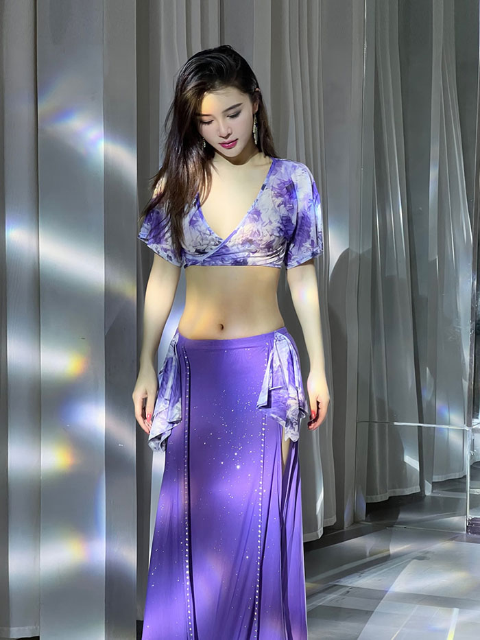 ベリーダンス 衣装 セット レッスン着 セットアップ おしゃれ 星屑 キラキラ メッシュ素材 Vネック スリットオーバー スカート ロング丈 おしゃれ ダンス衣装 ステージ衣装 ダンス 発表会 上下セ