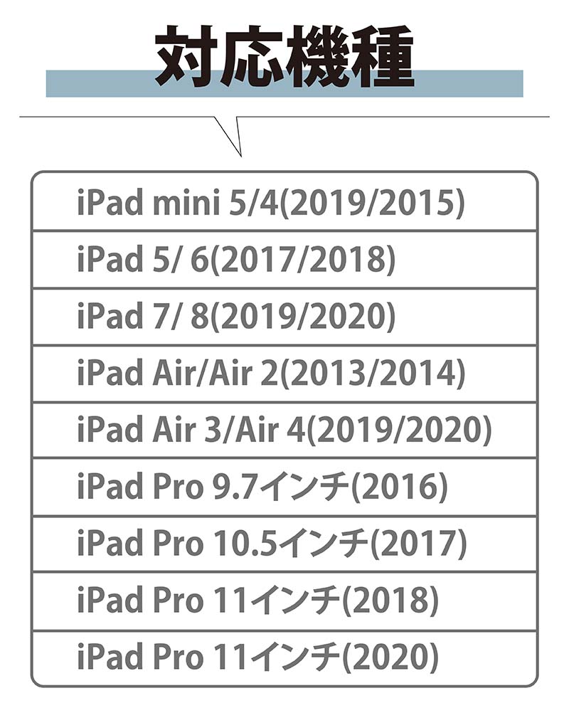 機種: iPad mini 5/4(2019/2015) iPad 5/6(2017/2018) iPad Air/Air 2(2013/2014) iPad 7/8(2019/2020) iPad Air 3(2019) iPad Air 4(2020) iPad Pro 9.7インチ(2016) iPad Pro 11インチ(2018) iPad Pro 11インチ(2020)