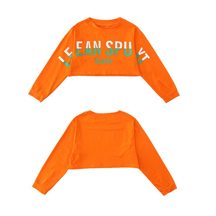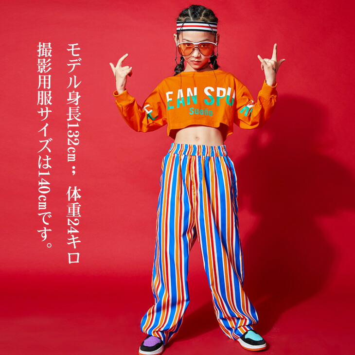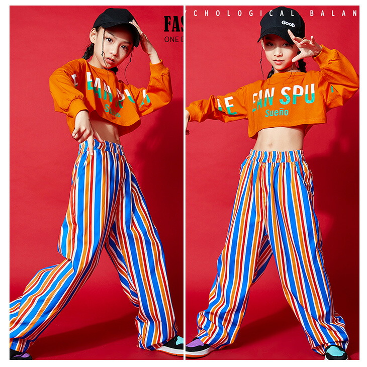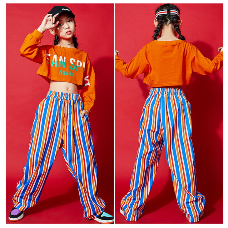 ダンス用 キッズダンス衣装 キッズ衣装 ダンスパンツ ストライプ ショート丈 へそ出し 長袖 ブルー オレンジ 薄手 派手 ボトムス カジュアルロンT プルオーバー 英文字プリント