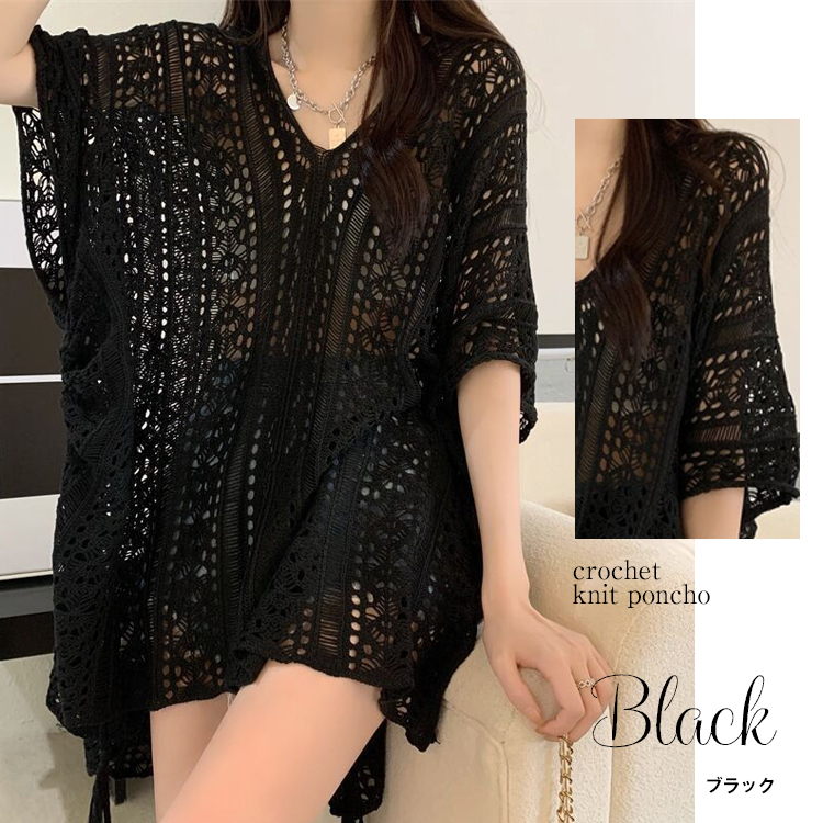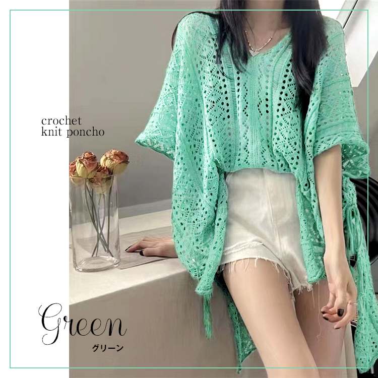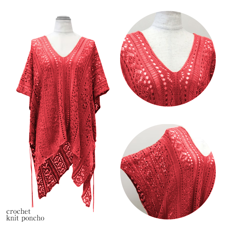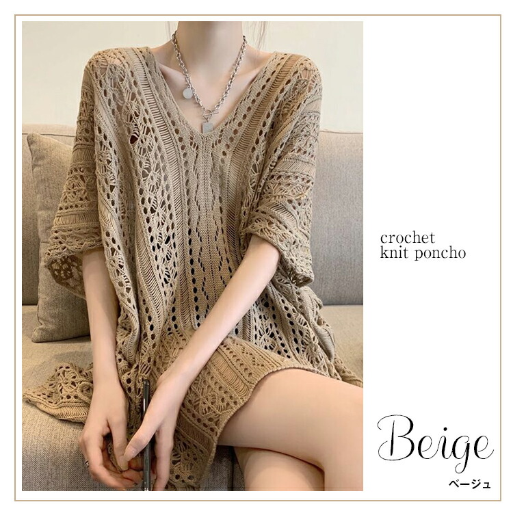 かぎ編みVネックポンチョ風ドルマンチュニック 春夏 透かし編みニット チュニック レディース トップス Vネック 重ね着 メッシュニット サマーニット 薄手 透け感アイテム レディース