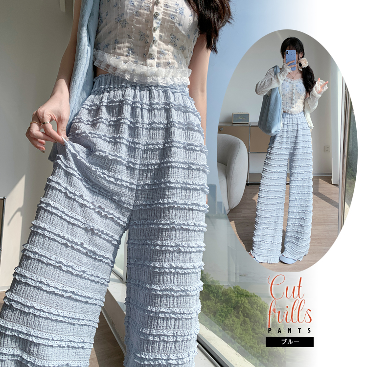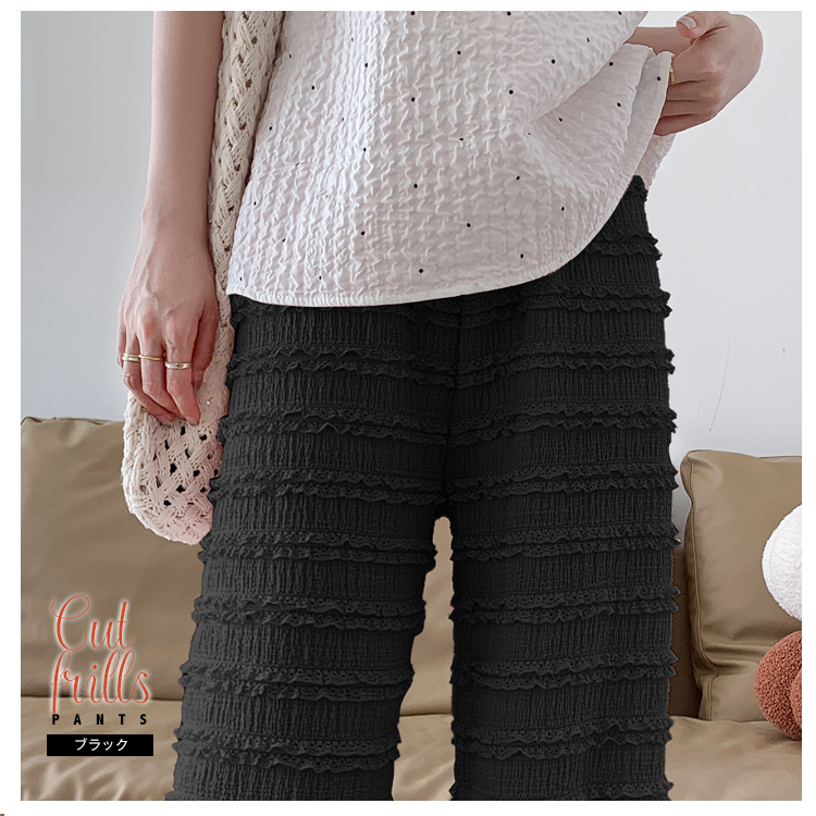 小さめなフリルのシアーなフリルカットワイドパンツ。