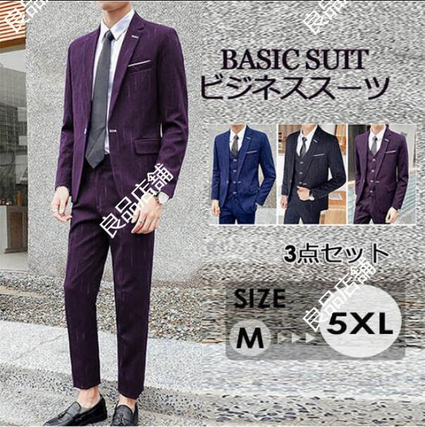 メンズファッション 3色 メンズスーツ 上品 縞々柄 ストライプ 3点セット 3ピーススーツ ビジネス 落ち着いたスーツ M~5XL 1つボタン カジュアル リクルートスーツ 冠婚葬祭