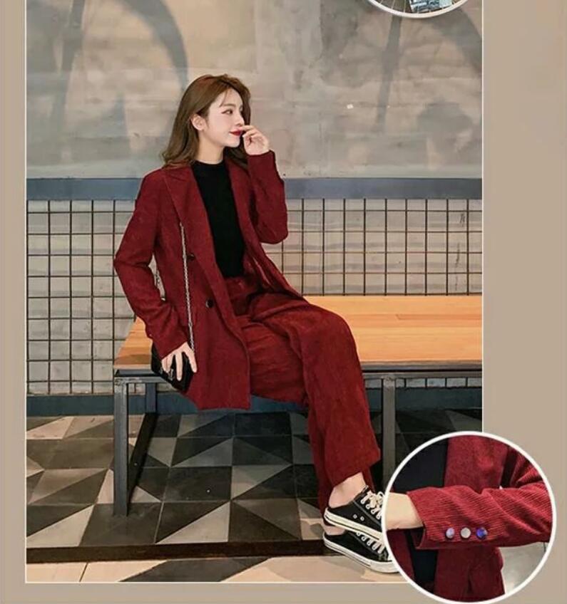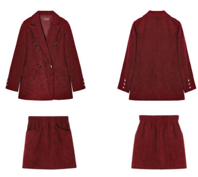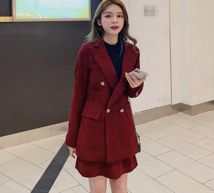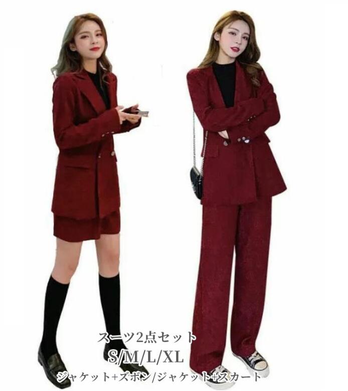 レディーススーツ 3点セット 上下セット ダブルボタンスーツ セレモニーフォーマル カジュアル パーティー スーツ コーデュロイ レトロ ジャケット+セーター+パンツ スカート ワイン赤