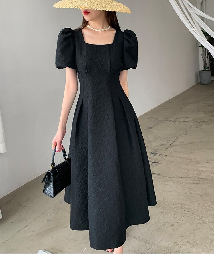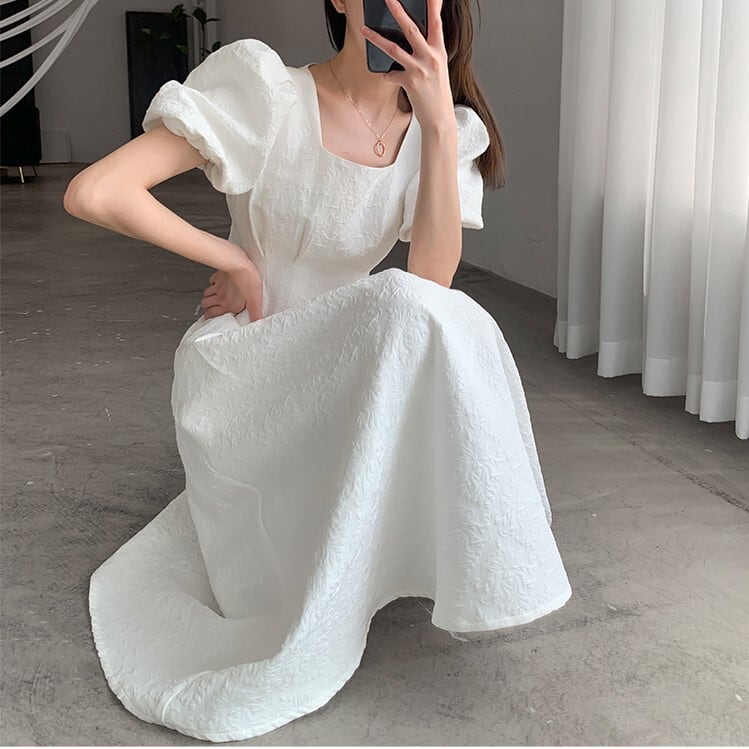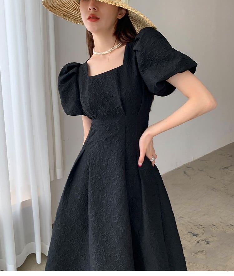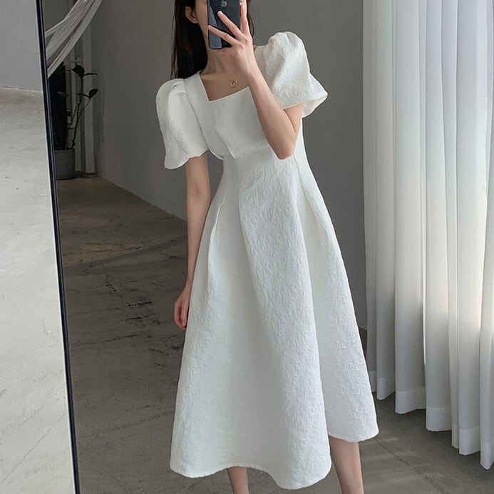 スクエアネック パフスリーブ ワンピース 半袖 ハイウエスト Aライン フレア 刺繍 モノトーン 薄手 シャガード アラベスク ひざ下丈 ミモレ丈 かわいい 大人可愛い きれいめ シンプル