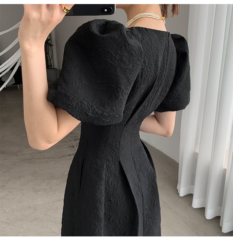顔周りをすっきり見せるスクエアネックとボリューム感のあるパフスリーブで小顔効果抜群。