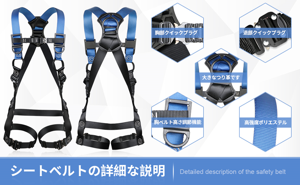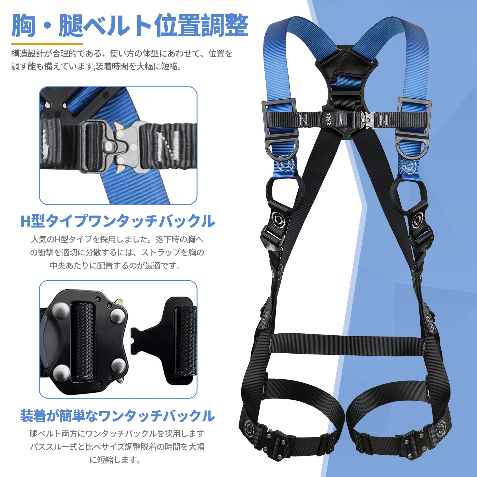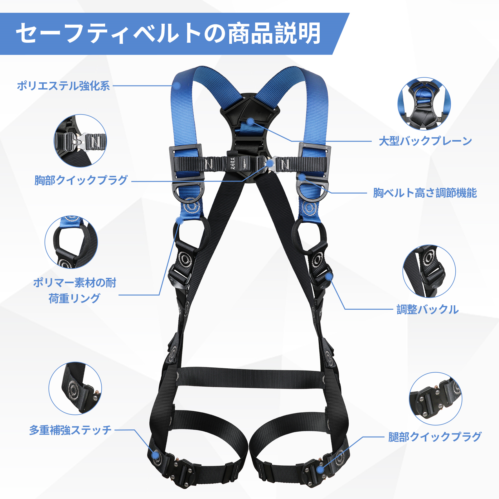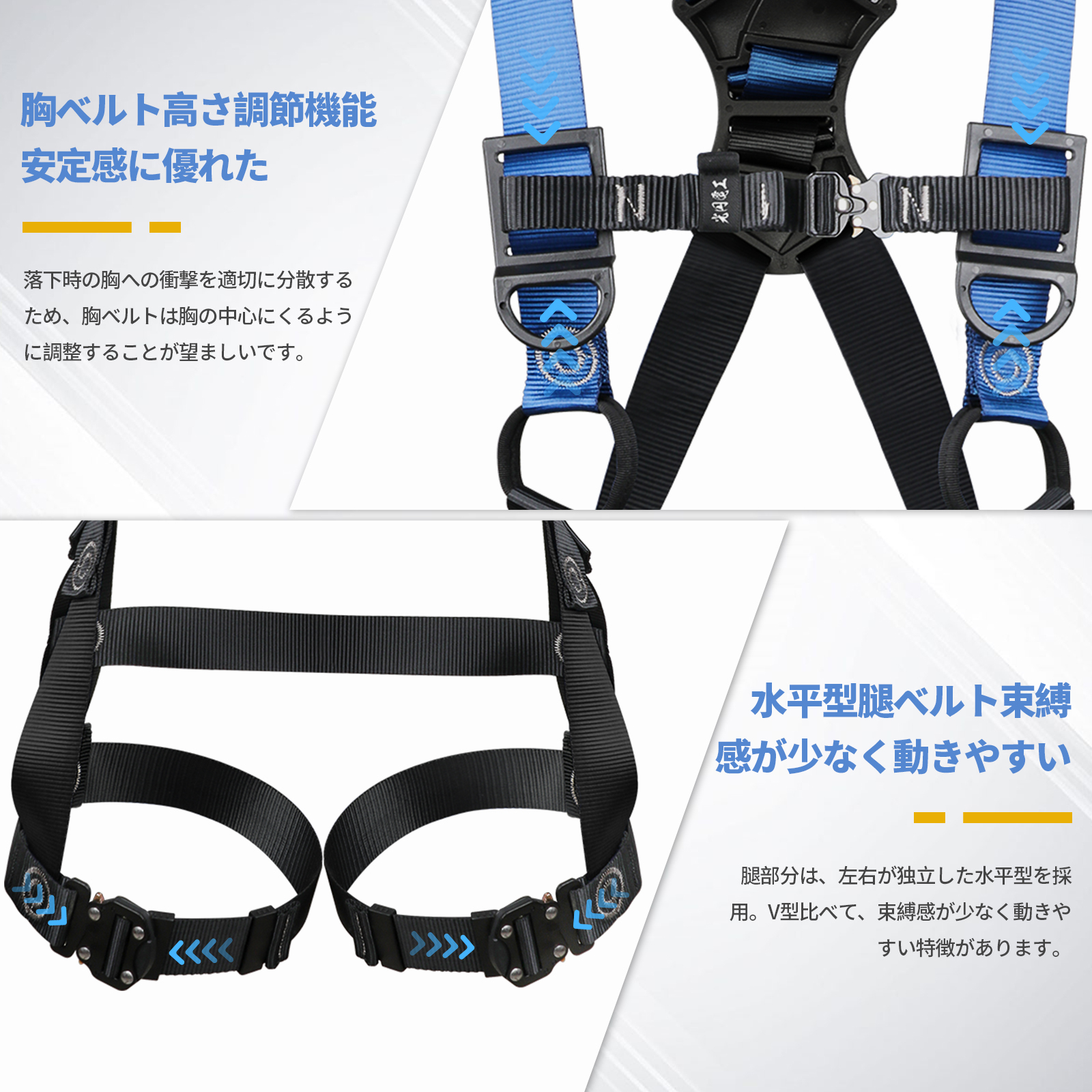【ご注意】フルハーネス安全帯 新規格 セット、高所作業やクライミングなどは非常に危険ですので、自己の行動と判断に責任を持ち、適切なトレーニング(技術および安全対策知識)を事前に習得してからご使用ください。使用方法が誤っていたり、メンテナンスが不適切な場合、重大な事故につながる可能性があることにご注意ください。私たちの店では、常に高品質の製品とサービスを提供することに注力しています。商品について何かアドバイスがございましたら、ぜひメールにてお知らせください。