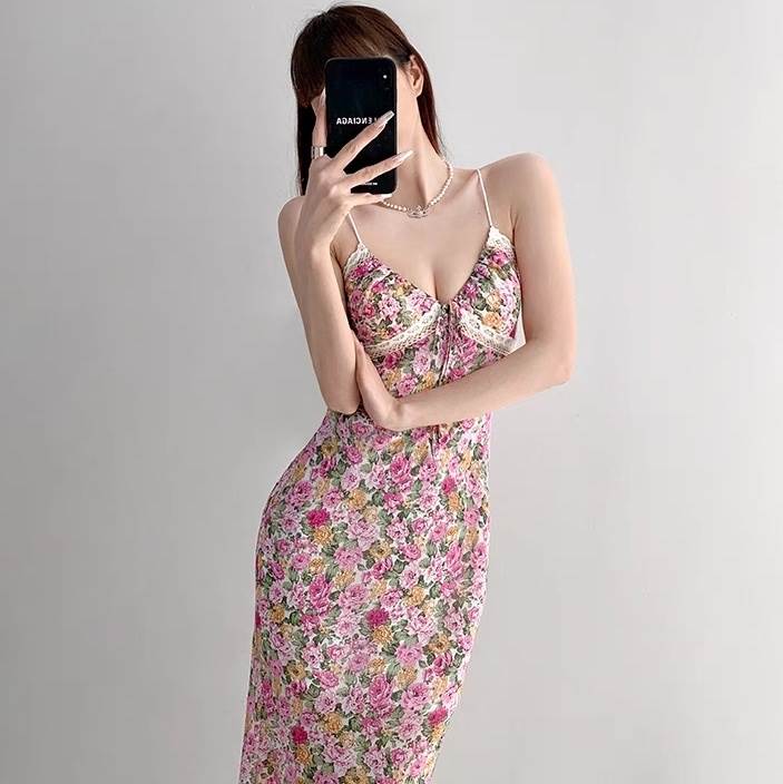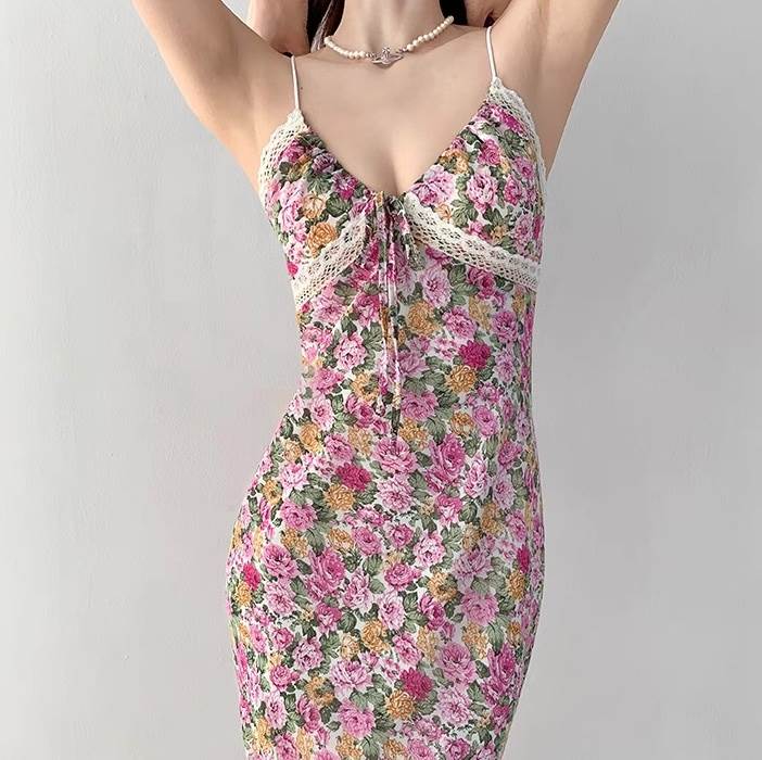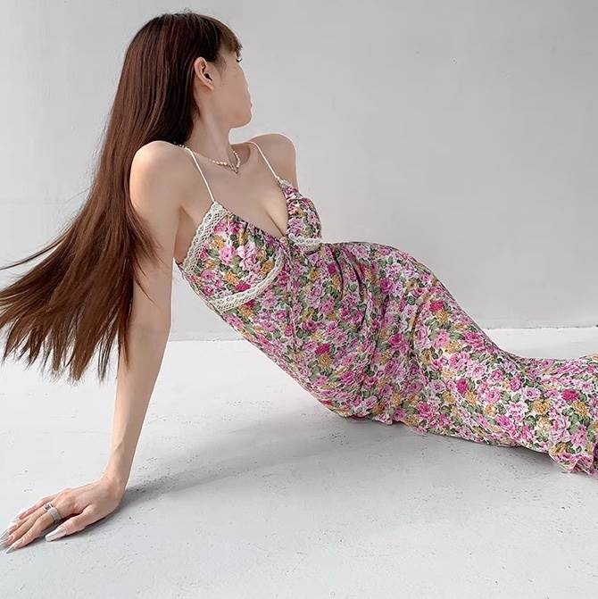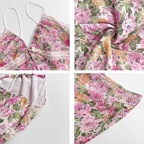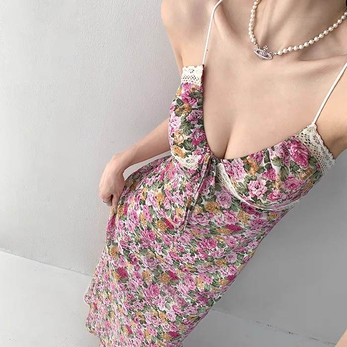 ピンクの花柄が、夏のデートやパーティー、リゾートシーンにぴったり。