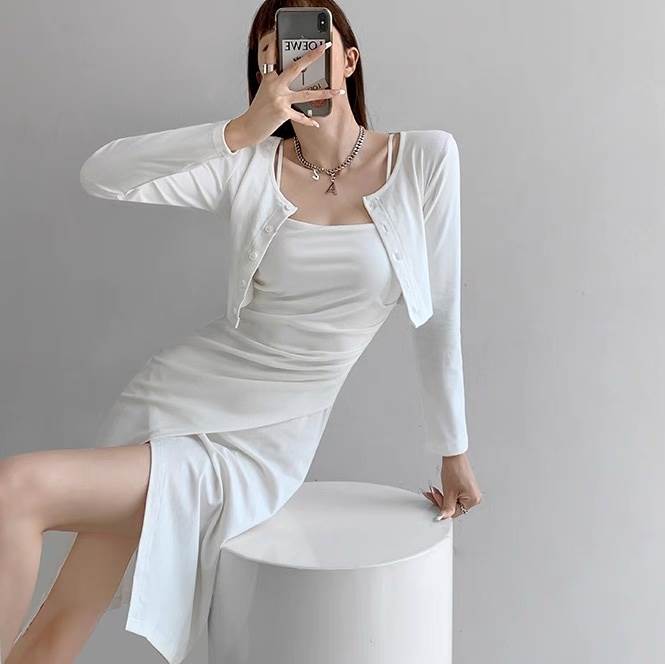 2点セット トップス ワンピース カーディガン レディース 羽織 前開き 膝丈 アシンメトリー 袖なし ノースリーブ 長袖 タイト スリム 細身 スマート フェミニン ストリート スリット サイドスリット かわいい 大人可愛い きれいめ シンプル カジュアル おしゃれ こなれ感 ラフ ガーリー クール 無地 春 夏 秋 お出かけ イベント リゾート ビーチ 休日 重ね着 普段使い 着回し レイヤード トレンド 流行 インスタ映え S M 白 ホワイト 黒 ブラック 茶色 ブラウン グレー ベージュ ピンク