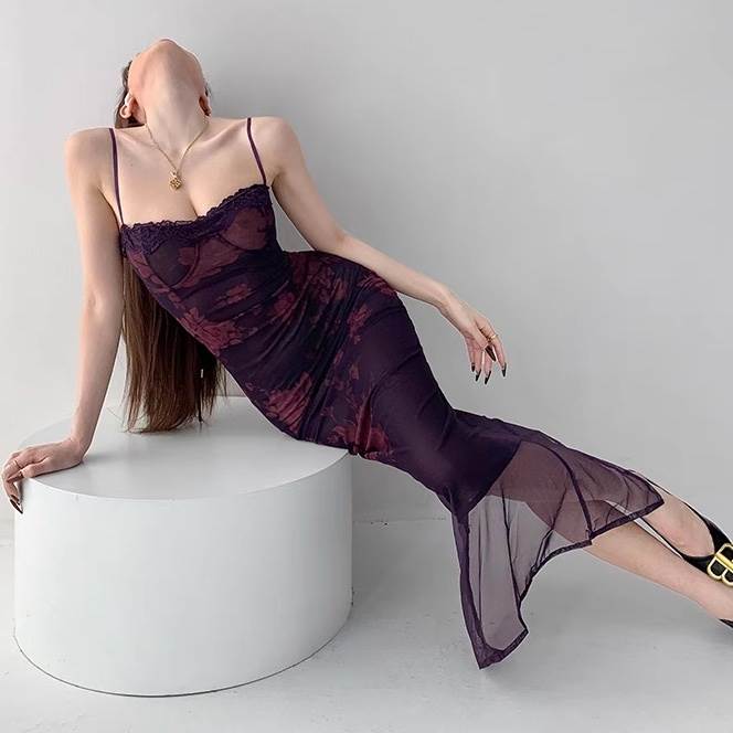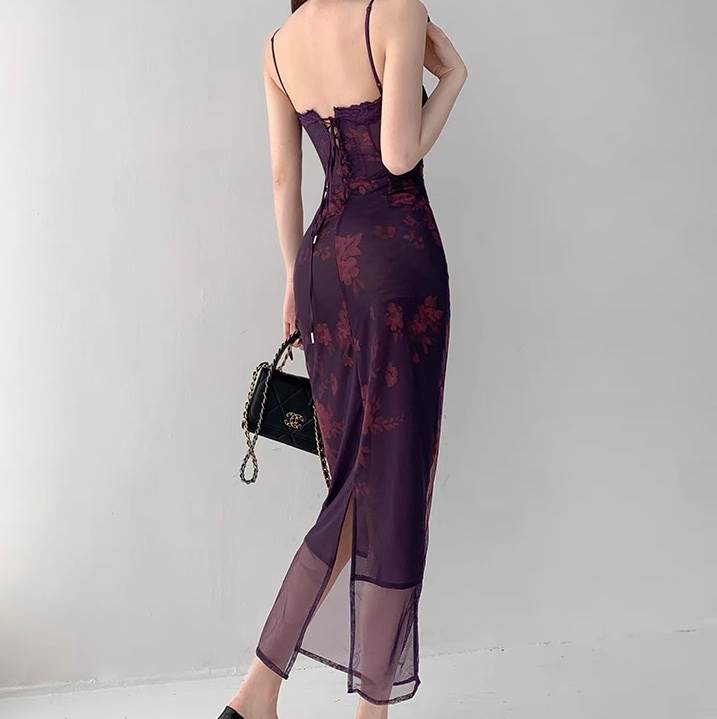 ワンピース レディース ロング マキシ 袖なし ノースリーブ タイト スリム 細身 Iライン 背中開き フェミニン レース ハイウエスト 編み上げ レースアップ 透け感 シースルー セクシー かわいい 大人可愛い きれいめ シンプル 上品 おしゃれ こなれ感 クール モード系 エレガント 主役級 存在感 抜け感 ヴィンテージ ラブリー キュート ラグジュアリー クラシカル ロマンティック 夏 パーティー イベント リゾート 休日 バカンス 美脚 脚長 トレンド 流行 インスタ映え S M 紫 パープル