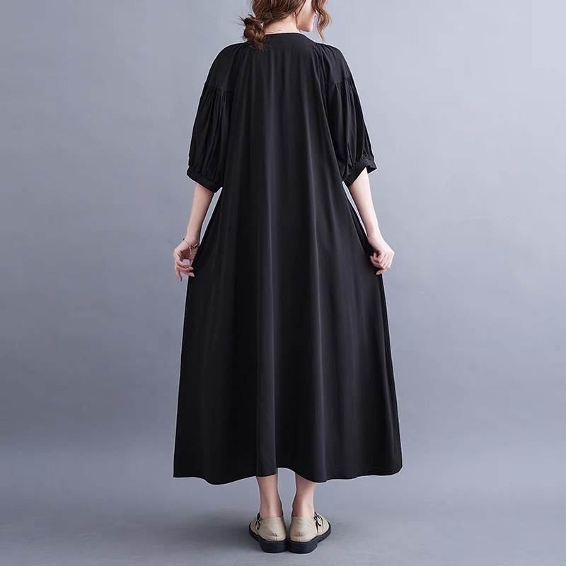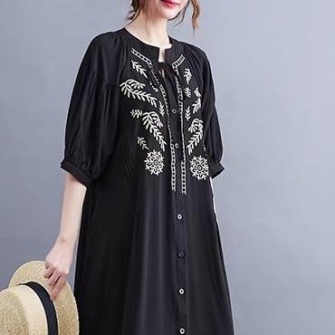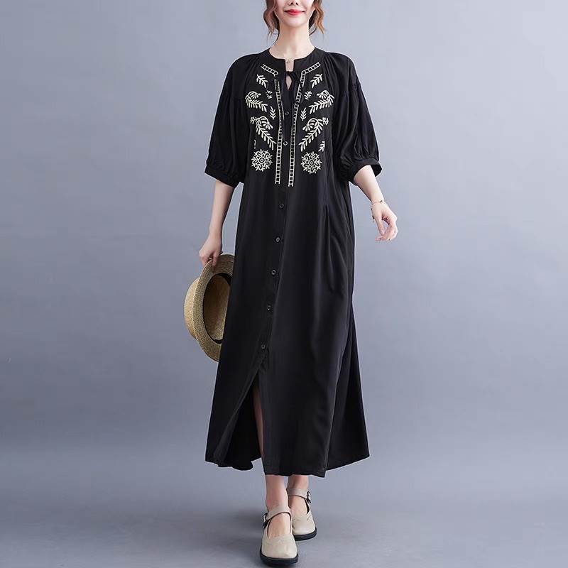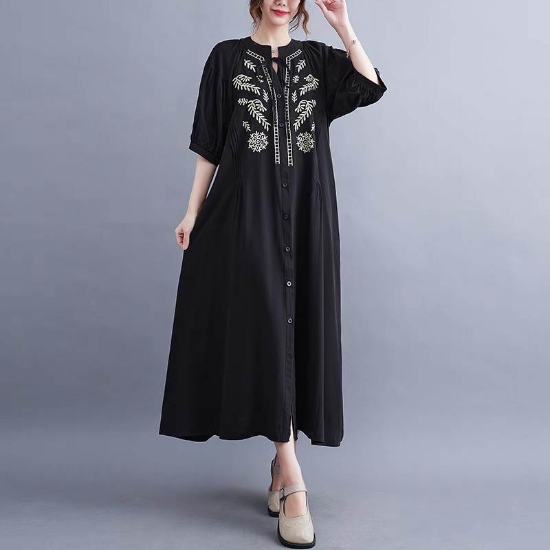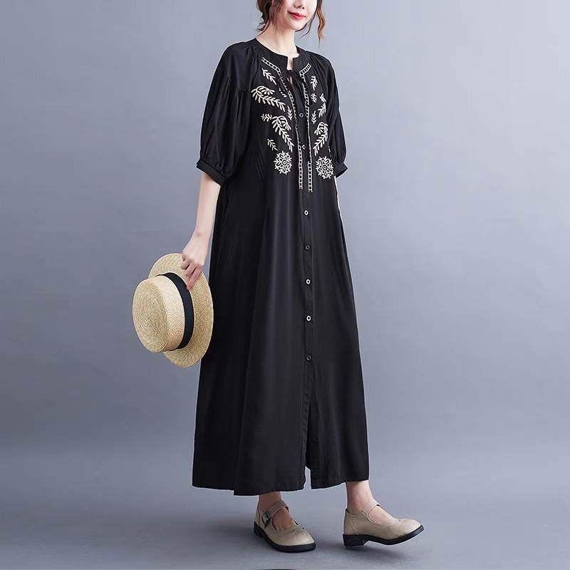 ワンピース レディース シャツワンピ フレア 前開き ロング 半袖 5分袖 ラウンドネック Aライン フェミニン ストリート 刺繍 リボン ウエストマーク ポケット ハイウエスト 異国風 かわいい 大人可愛い カジュアル おしゃれ レトロ アジアン エスニック エキゾチック ラフ ガーリー ルーズ ヴィンテージ ラブリー キュート ロマンティック ナチュラル 春 夏 お出かけ イベント リゾート 旅行 ビーチ 女子会 休日 バカンス ライブ フェス 普段使い 着回し L XL ゆったり ゆる 黒 ブラック