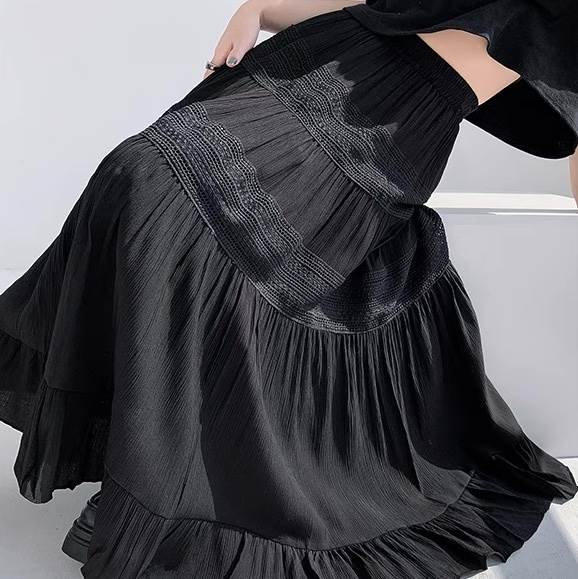 スカート ボトムス レディース フレア ティアード カラースカート フレアスカート ロング マキシ Aライン フェミニン レース 刺繍 ハイウエスト ウエストゴム 透け感 ヴィンテージ