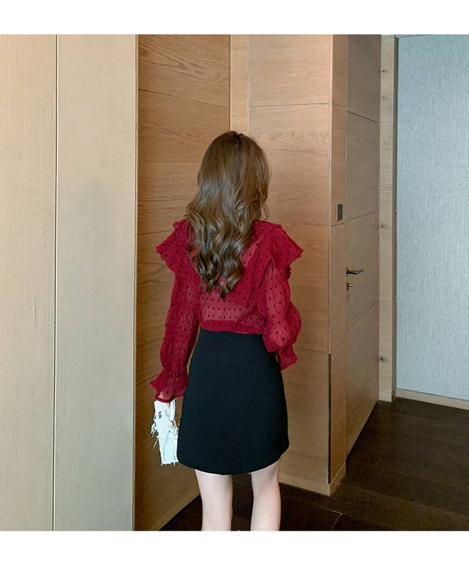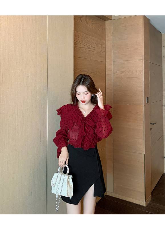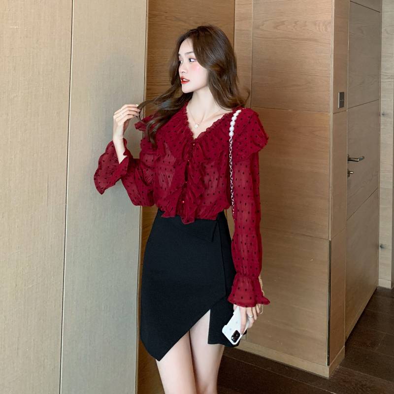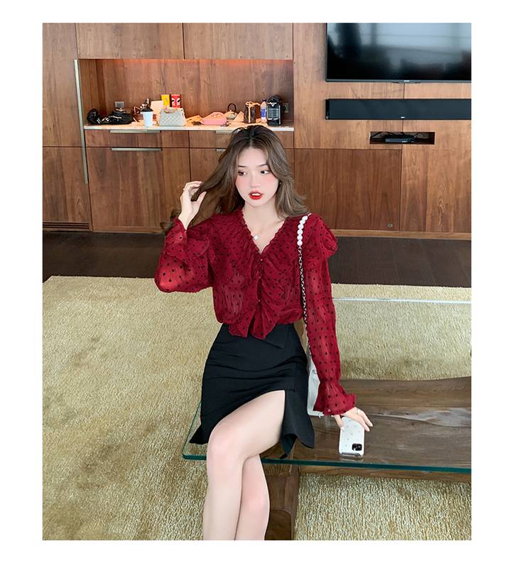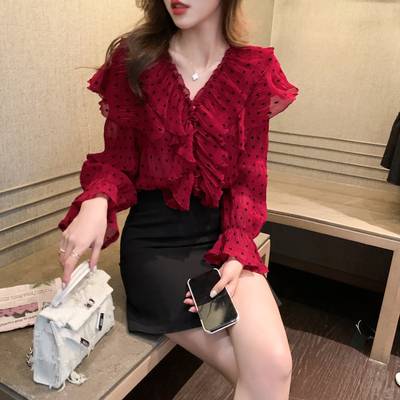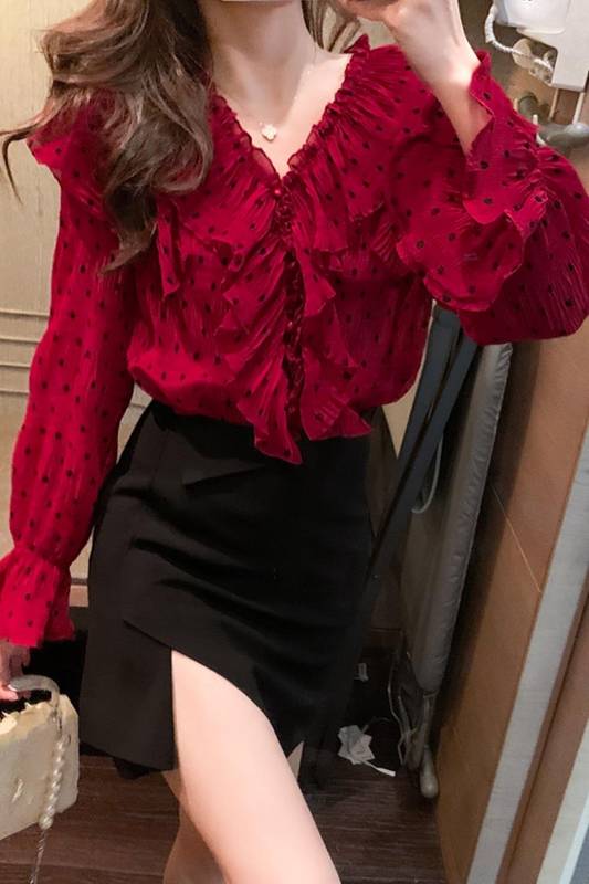 トップス レディース ブラウス シャツ 長袖 秋 冬 ドット柄 レッド フリル Vネック イベント 休日 お出かけ デート コーデ パーティー イベント ファッション エレガ