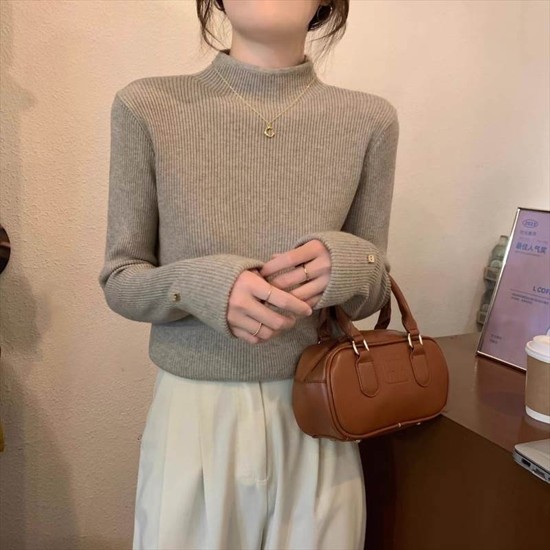 ボトルネックとボタンがアクセントで、シンプルでありながらフェミニンさを引き立てる一枚。