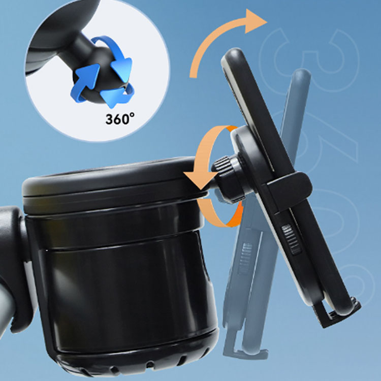 【スマホホルダー付き】スマホスタンドもあり、移動中もスマホを自由に使えます。スマホスタンドもあり、移動中もスマホを自由に使えます。クリップが360°回転し、縦・横自由に置けます。又、左右にスライドするので、左利き・右利きも対応します。ワンタッチストレッチで置け、簡単にセッティング出来ます。画面上にもそのまま操作が可能です。強力バネ内蔵で幅5.6~9cmのスマホを挟む事が出来ます。