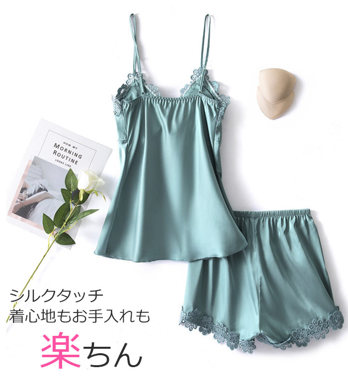 キャミソール カップ付 美盛り セットアップ シルクタッチ 大人 可愛い 下着 インナー ショートパンツ セクシーランジェリー パジャマ レディース セットアップ パジャマ 夏 部屋着 2点セット 部屋着上下セット 光沢 なめらか 春 夏 合成シルク 無地 4色/M/L/XL