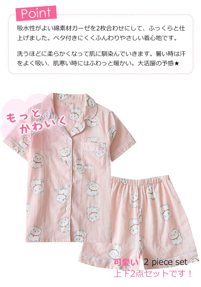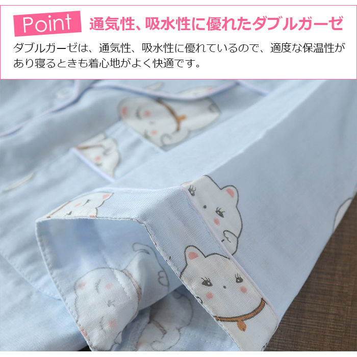 招き猫柄 肌にやさしい綿100% 上下セット 柔らかい肌触り ガーゼ パジャマ 長袖 初夏・夏 ナイトウェア ルームウェア 母の日 プレゼント ギフト 実用品