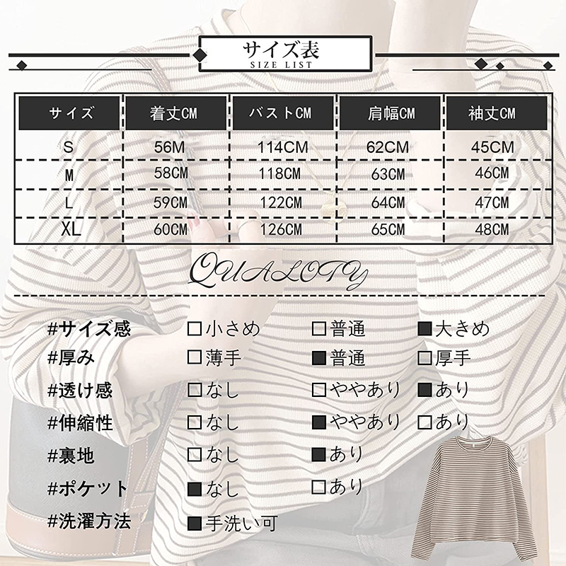 【シンプルデザイン・各シーン大活躍】きちんと感のあるボーダーロンTシャツは学校行事など多彩なシーンで活躍。ボーダーロンニットTシャツは、フェミニンで清潔感のあるデザインが人気のポイントです。きちんとした印象で着こなせるため、オフィスやPTA行事などでも活躍します。清潔感のあるボーダーロンTシャツは周囲に好印象を与えられるので、親戚の集まりなどの場面にもおすすめです。生産国 made in china