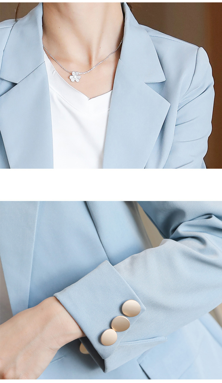 ウエストラインが程よくシェイプされたひとつボタンノーカラージャケット。程よく身体に寄り添うシルエットが華やかで女性らしい印象になります。パンツやスカートとセットにしてビジネスでの着用はもちろん、入学式やパーティーなどでも活躍してくれる万能アイテムです。