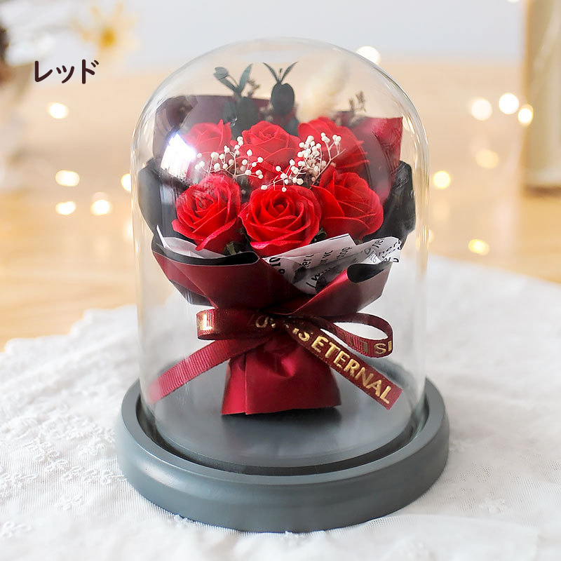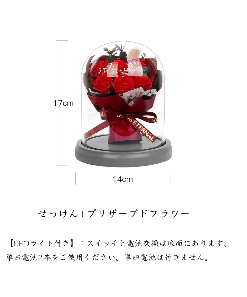 【お手いて方法】:決してお水をあげないでください。 湿度が高い場所には置かないでください。 直射日光のあたる場所には置かないでください。(花びらの色褪せや液ダレ、鮮度などに影響がありますのでお避けください。) 風通しの良いところに保存してください。生産国 made in china