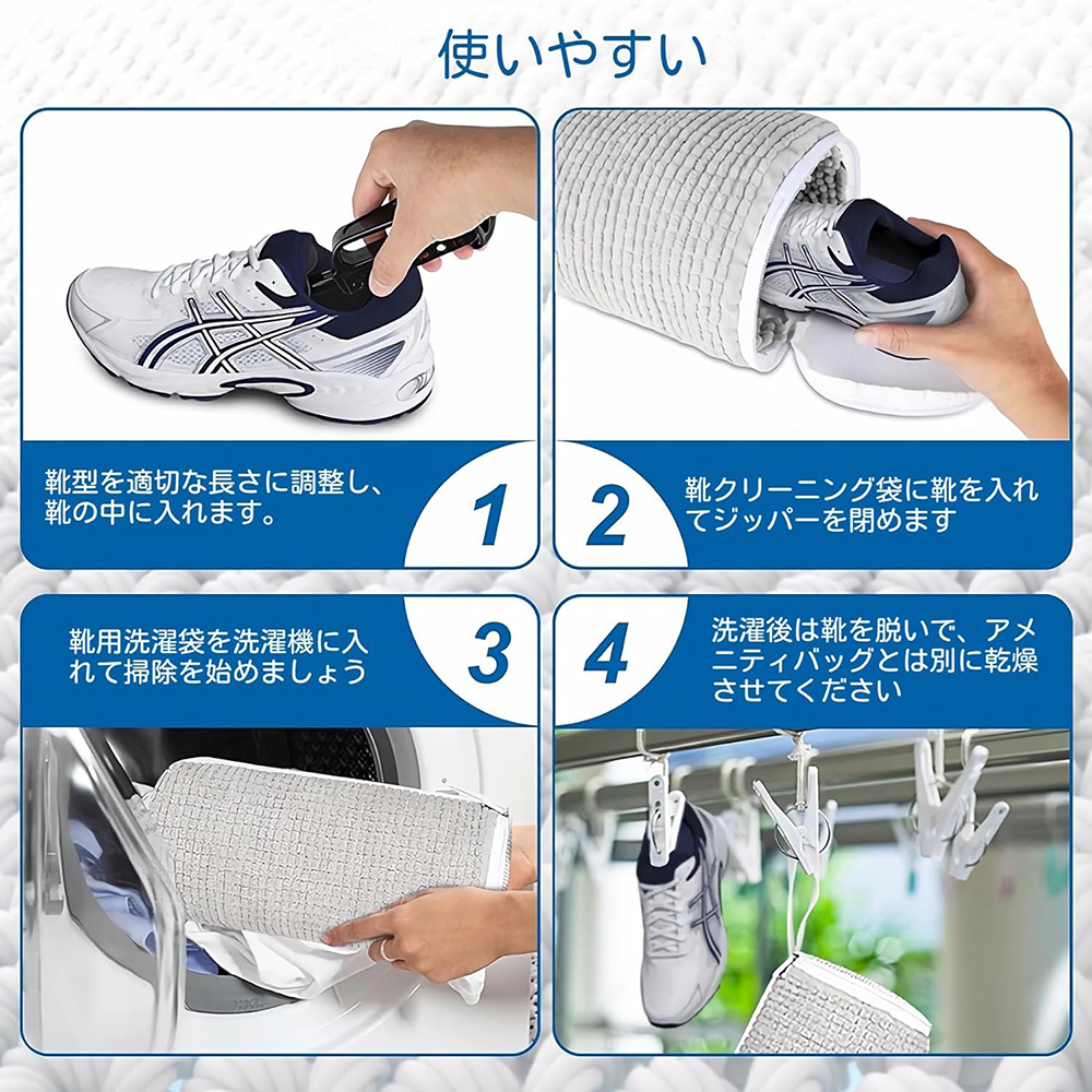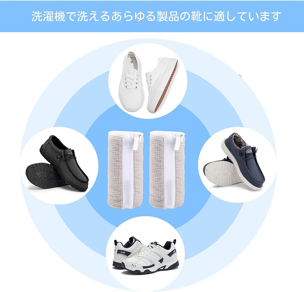 お掃除の際は片足をネットの中に入れてください。 網目の隙間が多いと網目との摩擦が生じ、洗浄力が高まります。 子供用の靴の場合は、ネットの両側に 1 足ずつ置くのが最適です。