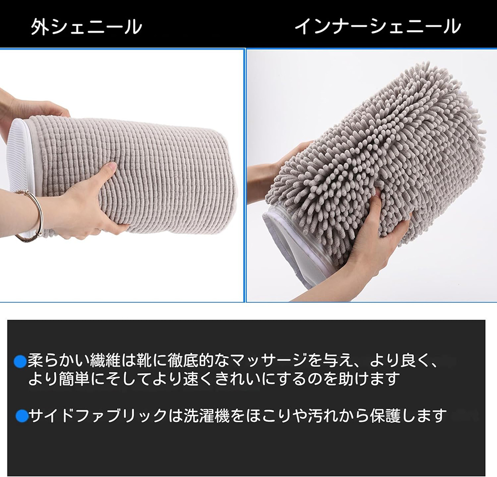 【高品質の素材】: 靴 洗濯機 は、高品質な繊維素材を使用し、細部と品質にこだわって作られています。内部は、3000本以上の毛羽繊維を使用し繊維は細かく柔らかく、靴の表面を優しく清潔に保ち、すべての靴が独特の輝きを放つようにします。