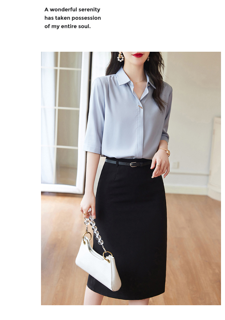スカート:Q50スカート/Q58スカート商品内容 シンプルで上品なvネックブラウスになります。薄めのサラッとした生地感で軽やかな着心地が女性らしい印象に仕上がります。袖口はノースリーブでもなく半袖でもない上品な見えするフレンチスリーブで、一枚でもアウターを重ねてもまとまりのあるスタイルに。サイドの裾は軽くギャザーがより、裾をインしてもアウトで着てもお洒落に着こなすことができます。