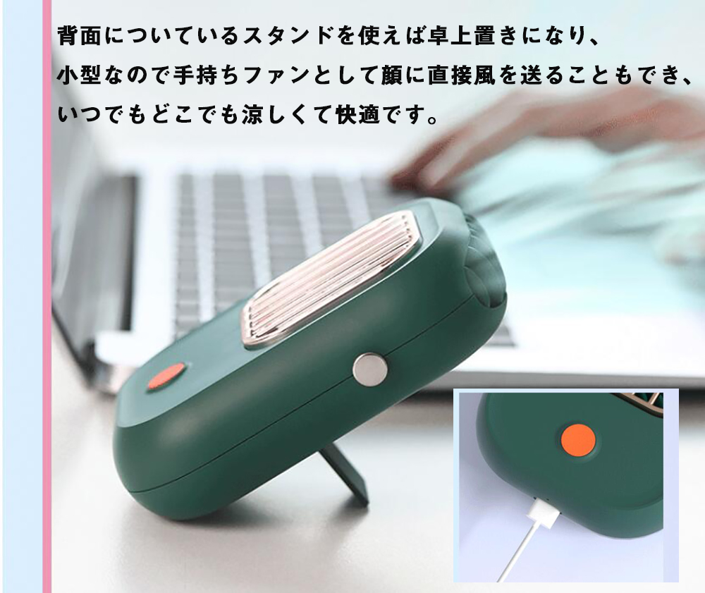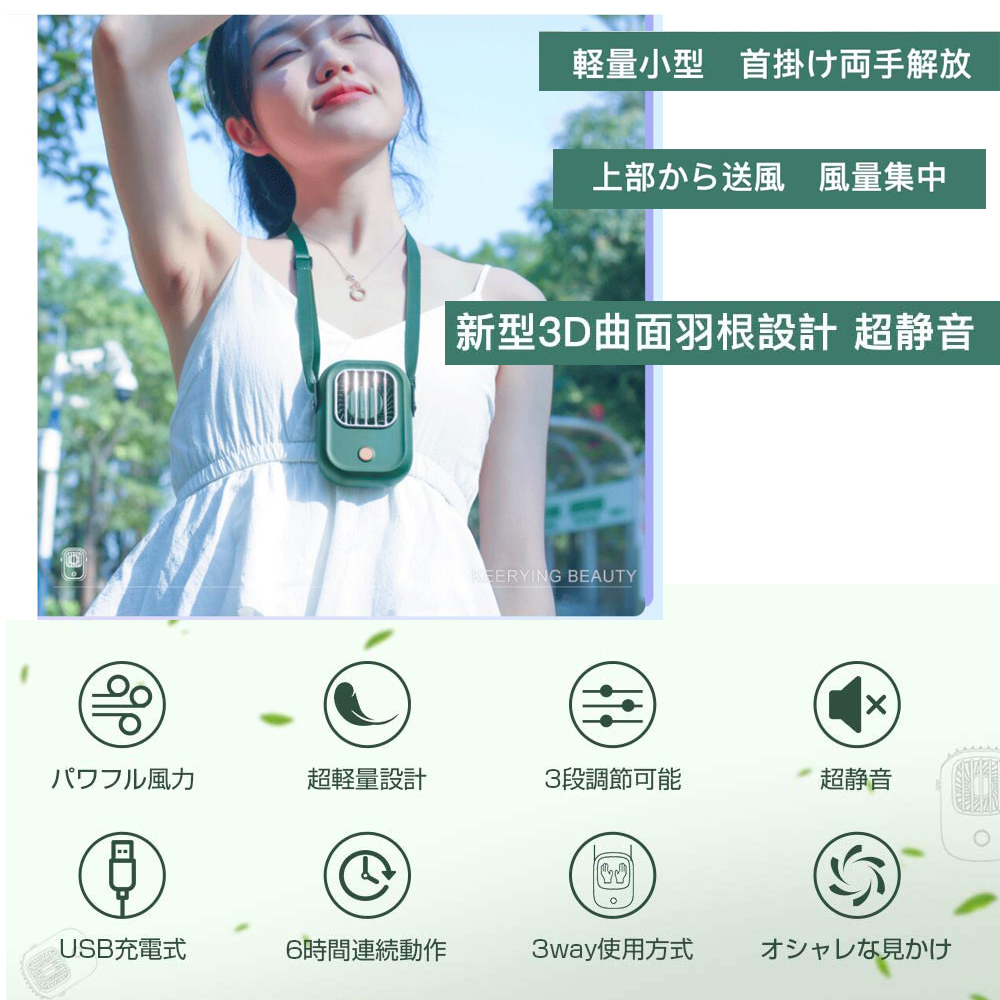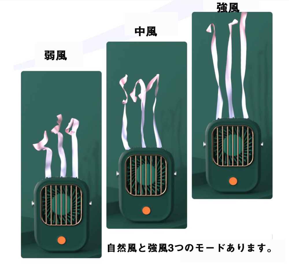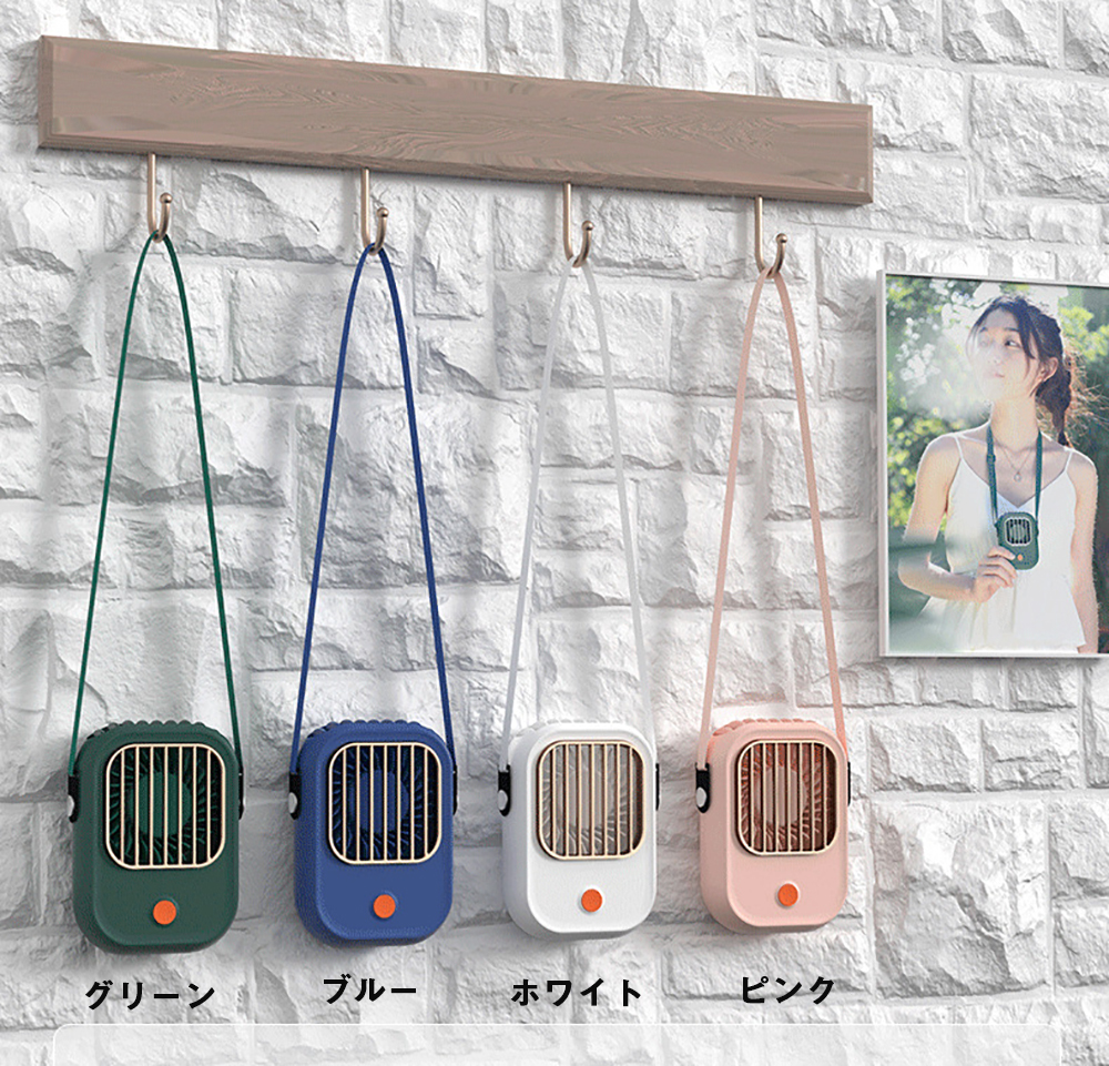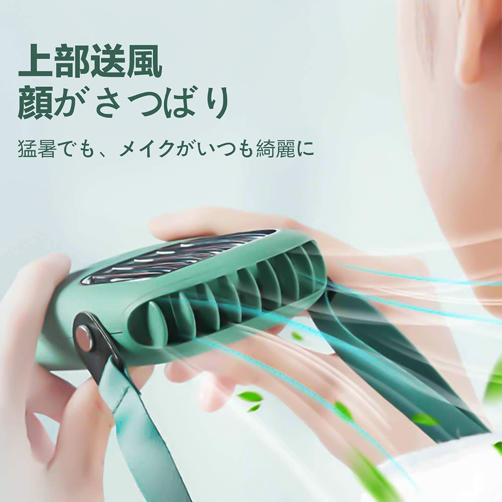 3段階風量調整 パワフル扇風機色 グリーン、ピンク 、ブルー、ホワイト商品内容 【上部から送風 首かけ扇風機】正面から空気を吸い込んで、上に向けて送風する携帯扇風機です。長さ調節と着脱可能なネックストラップで首から下げて、首元から顔に風を流すことで電車の中、歩行中にも涼しく感じられます。また、ハンズフリー扇風機だから、両手を自由にして、荷物やスマホで手が埋まるときにも涼しい風を浴びてリフレッシュ!暑さが厳しい日に、首元を冷やすことで一層涼しさを体感でき、特にマスクをして外を歩いても蒸れ感がだいぶ軽減され、熱中症防止にもなってくれます。