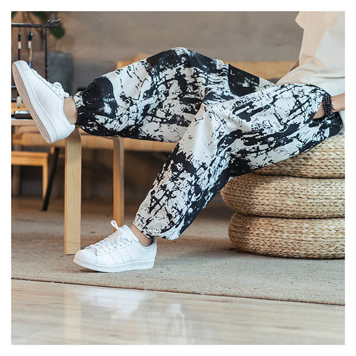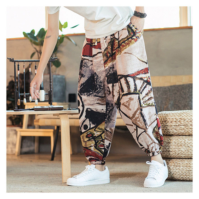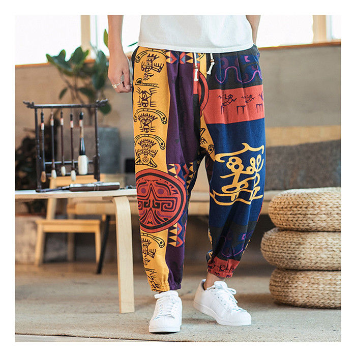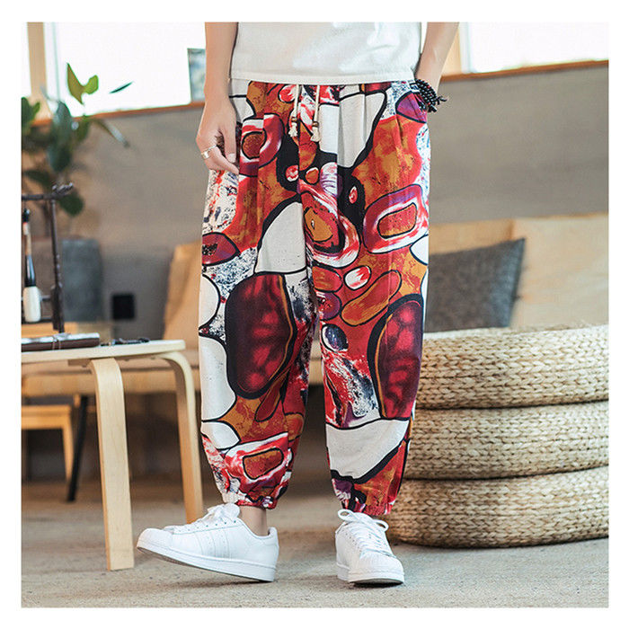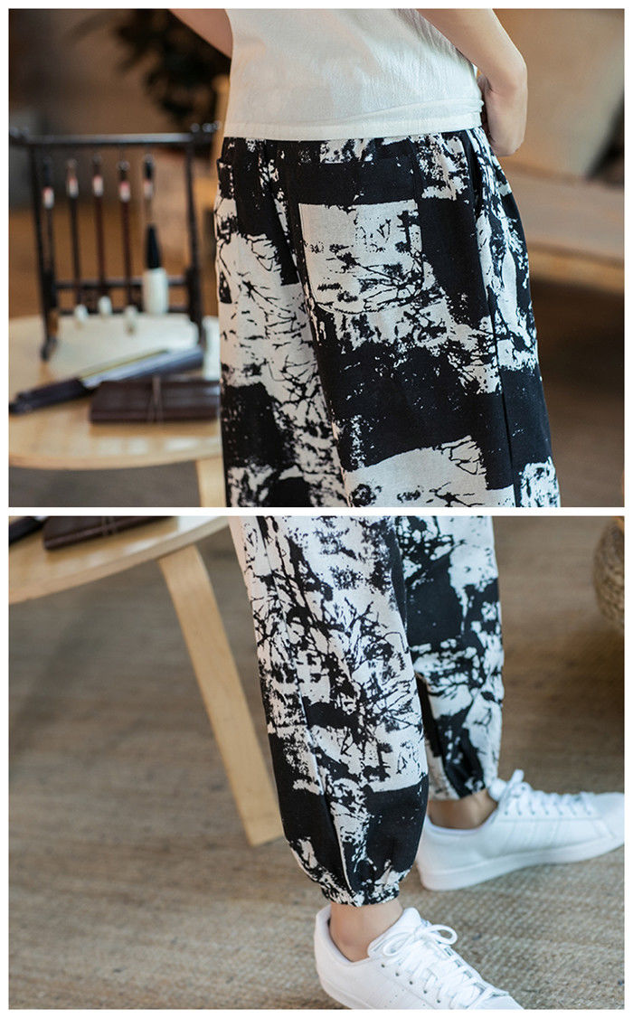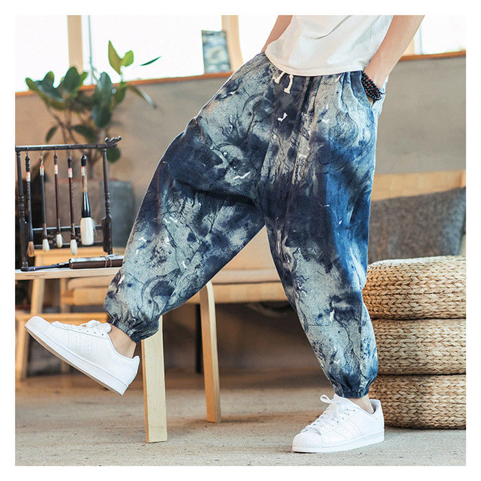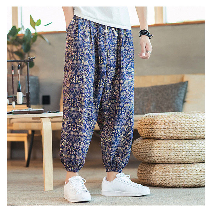 綿麻 総柄 九分丈 サルエルパンツ ハ
