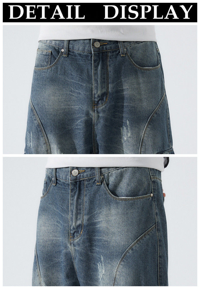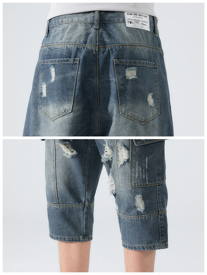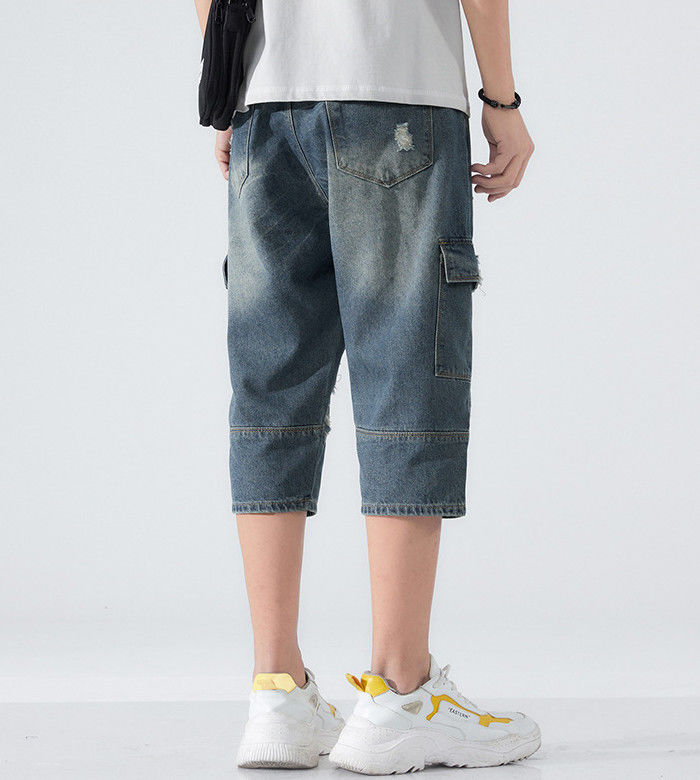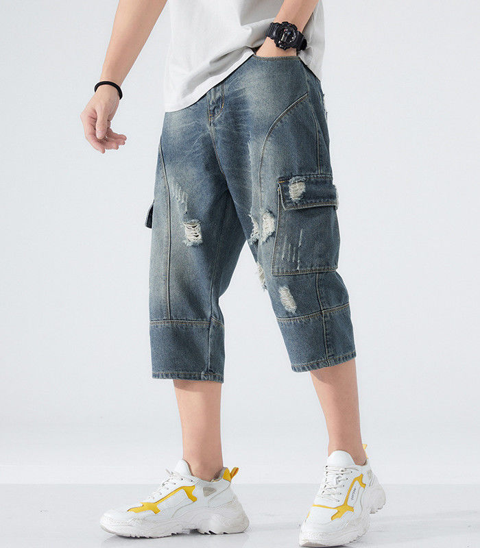 春夏新作 ジーンズ ダメージ加工 デニムパンツ 男性用 クラッシュ 七分丈パンツ ブルー 2colors