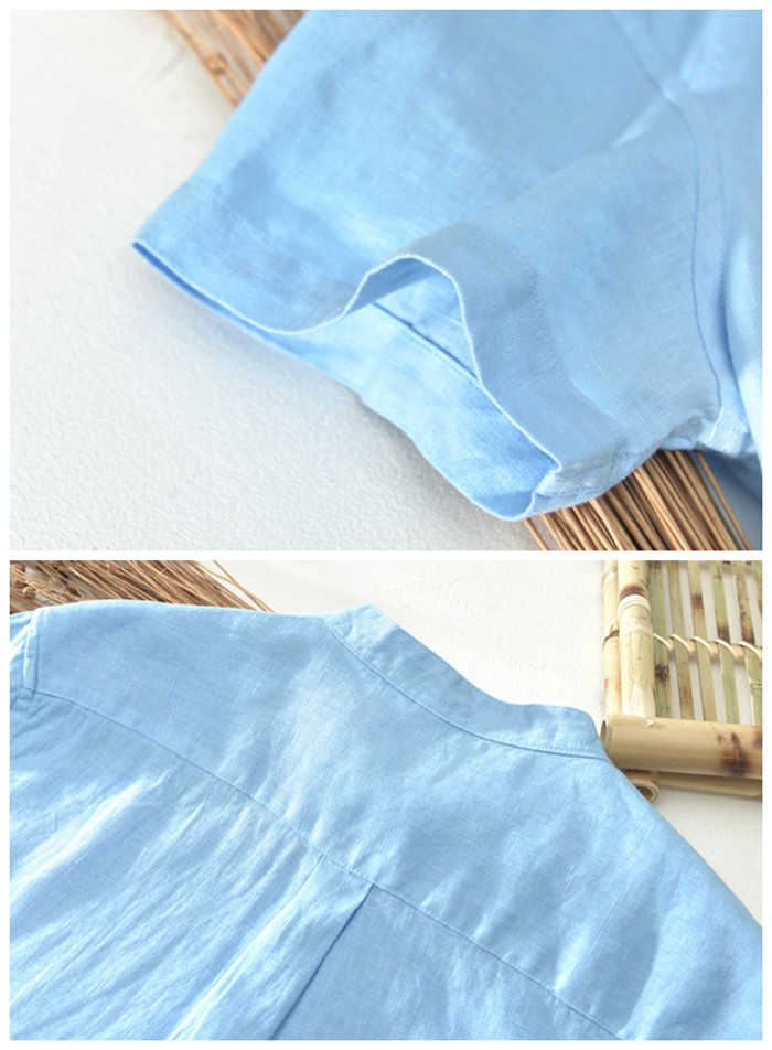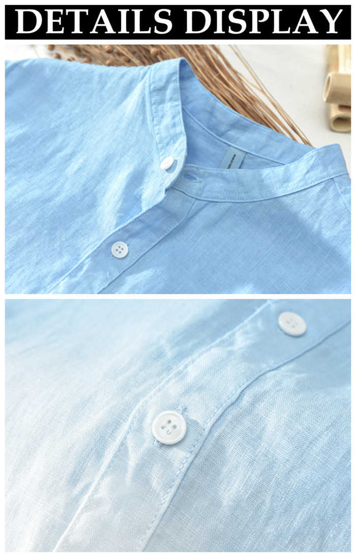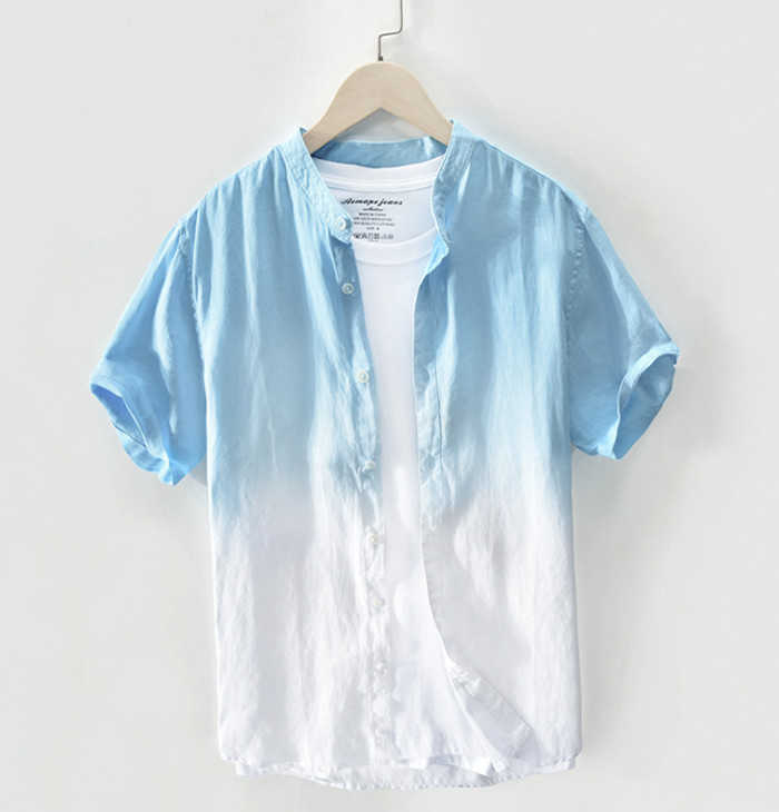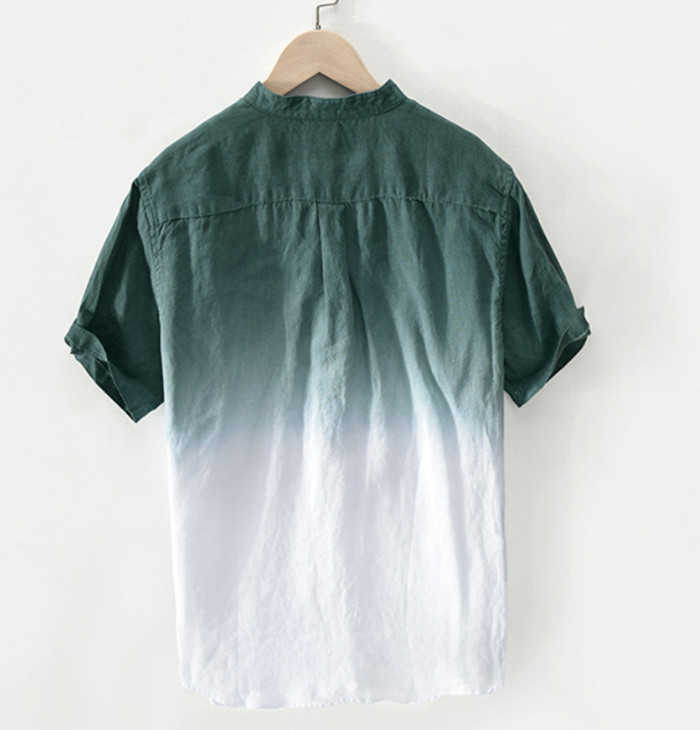 亜麻 立ち襟 半袖シャツ グラデーショ