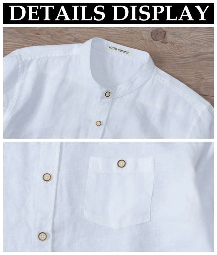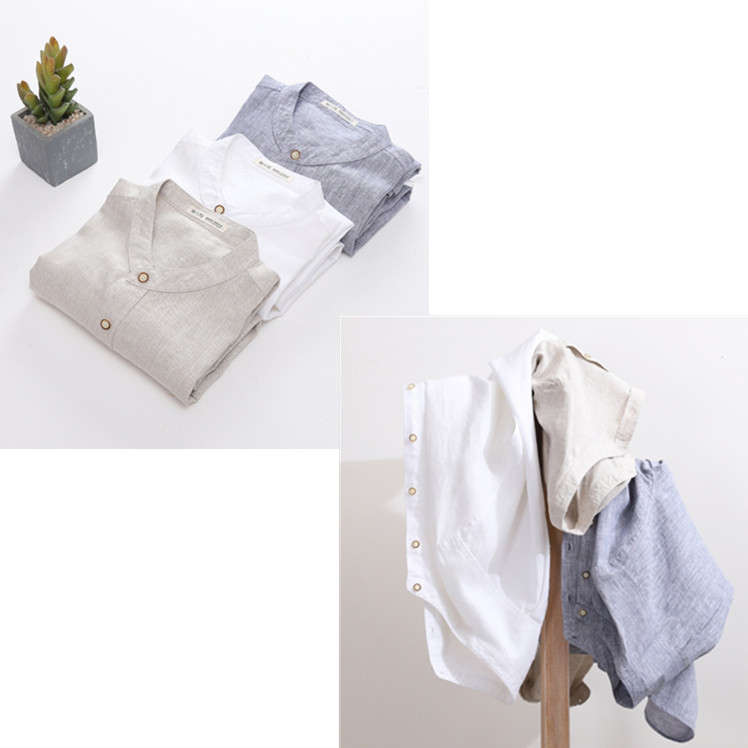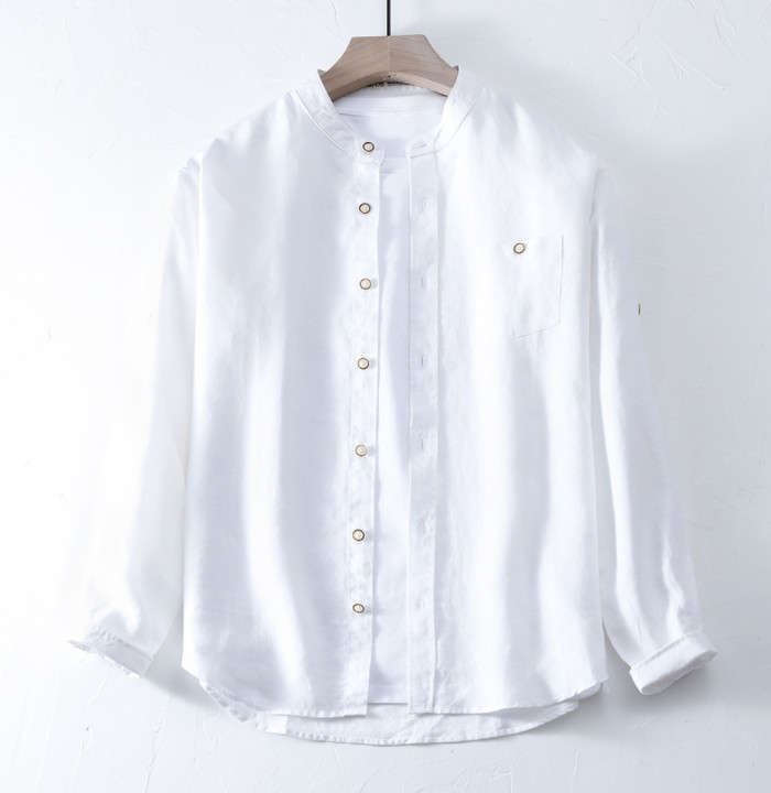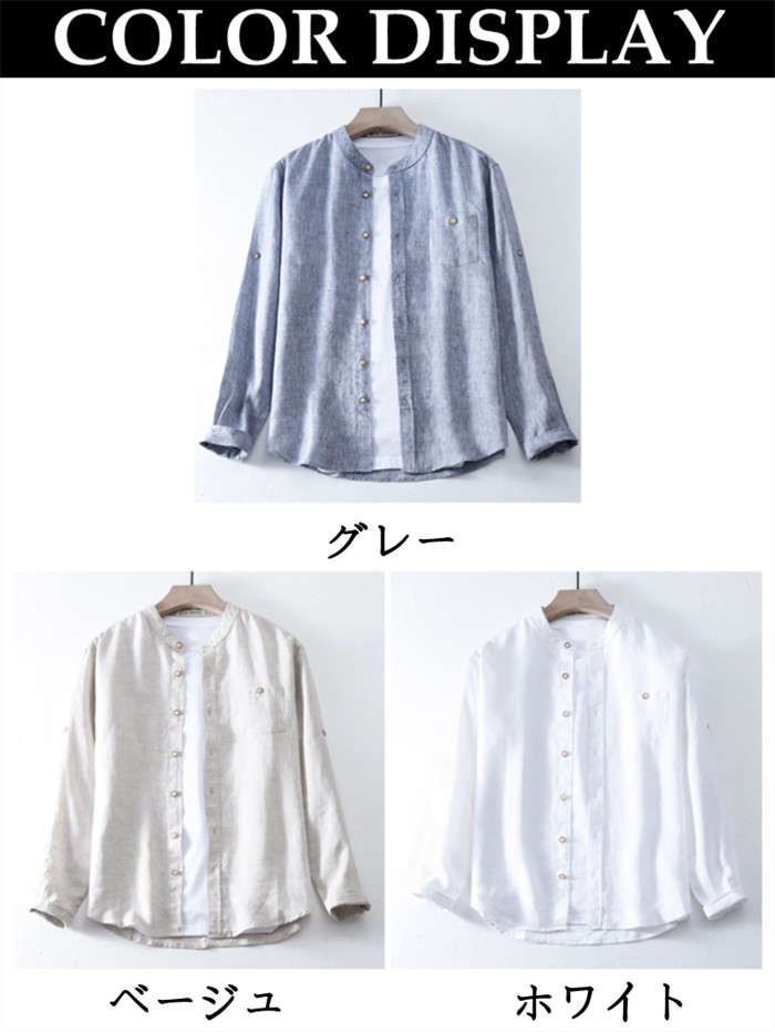 綿麻 長袖シャツ 立ち襟 カジュアル
