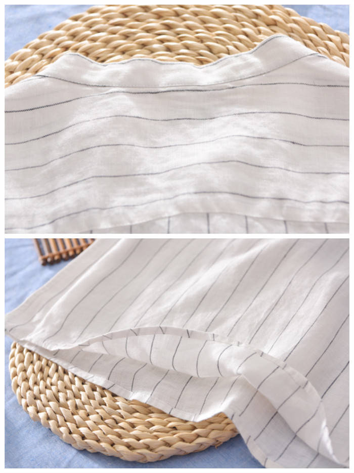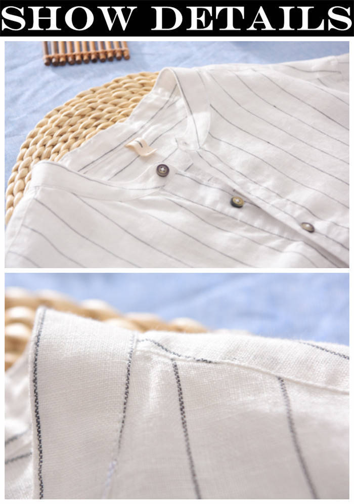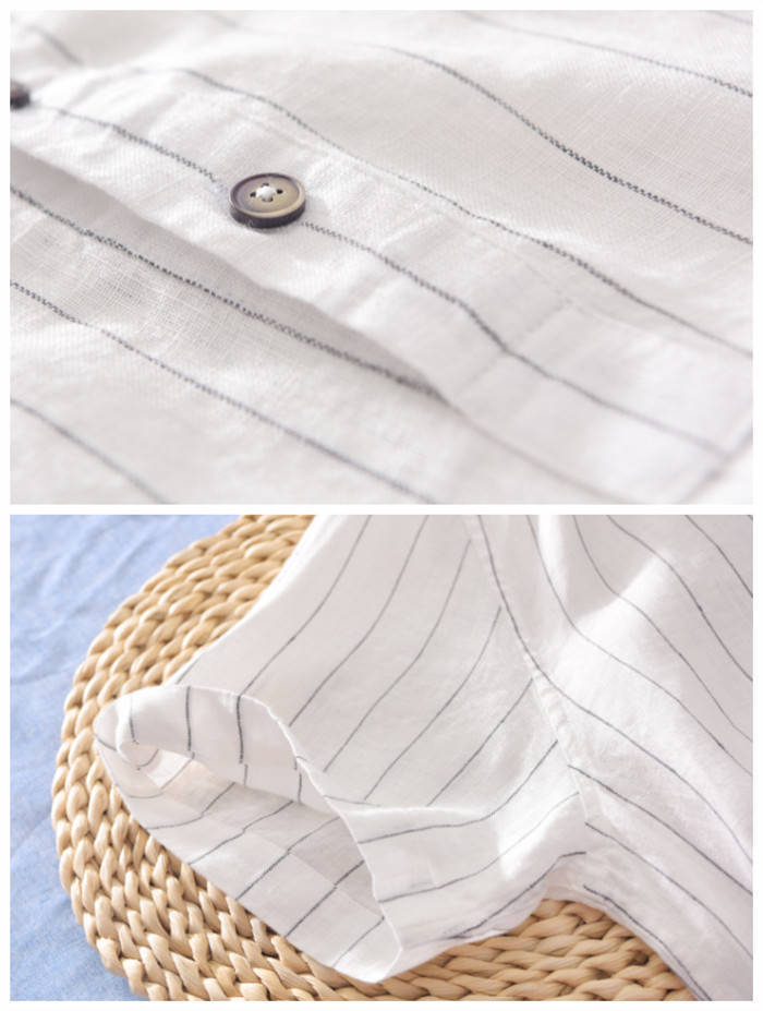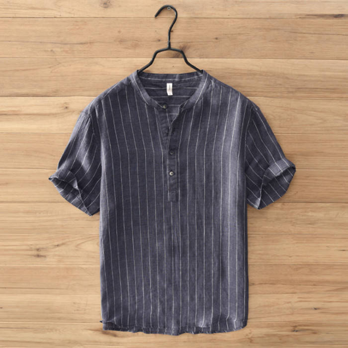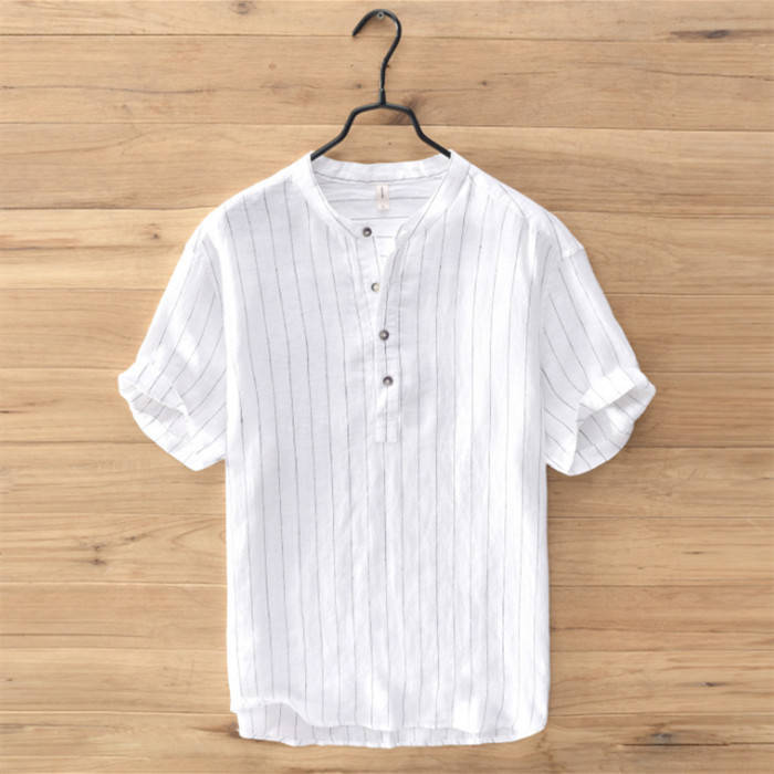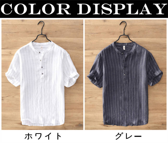 綿麻 半袖Tシャツ 立ち襟 ストライプ