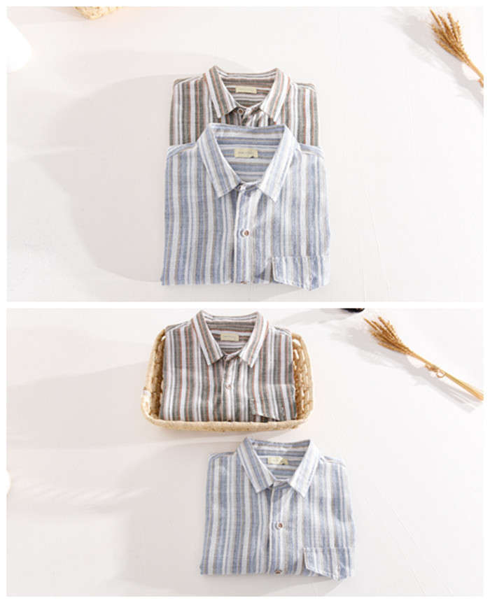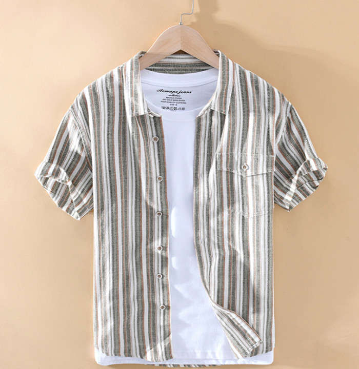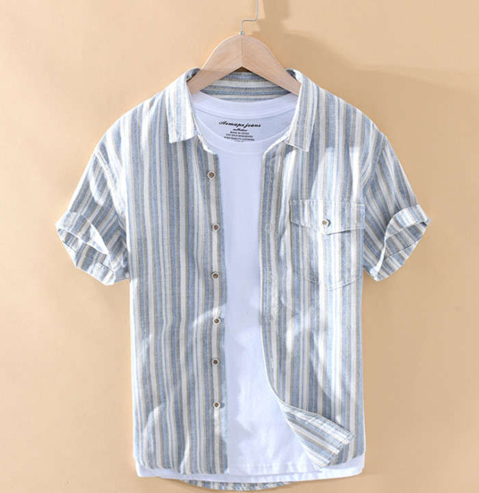 綿麻 半袖シャツ ゆったり ストライプ柄 カジュアル 男性用 トップス 夏物 2色 藍色メンズファッション トップス カジュアルシャツ