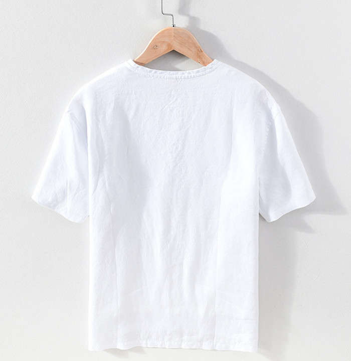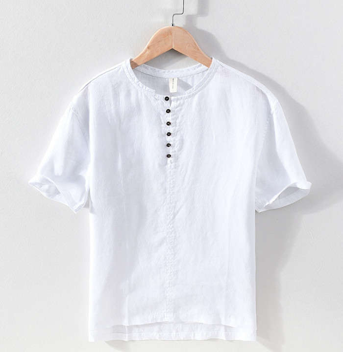 綿麻 半袖Tシャツ 立ち襟 無地 ヘンリーネック カジュアル 男性用 トップス 夏物 2色 白色メンズファッション トップス Tシャツ カットソー