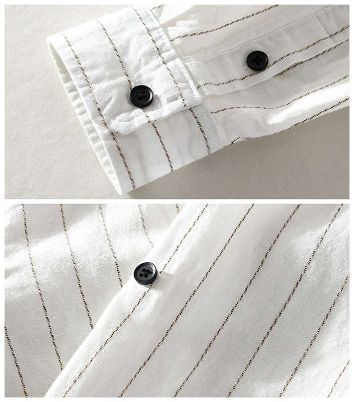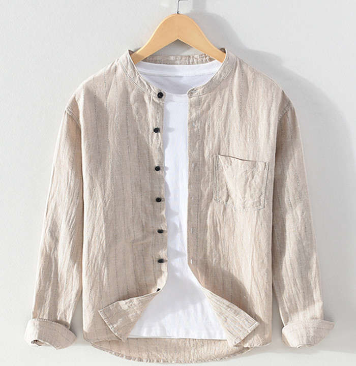 綿麻 ストライプ柄 立ち襟 長袖シャツ