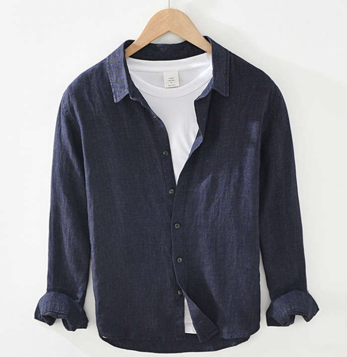 綿麻 ストライプ柄 長袖シャツ カジュアル 男性用 トップス 春服 2色 ネイビー カーキメンズファッション トップス カジュアルシャツ