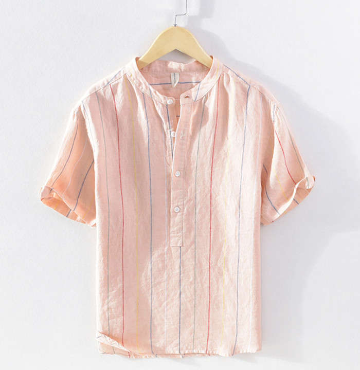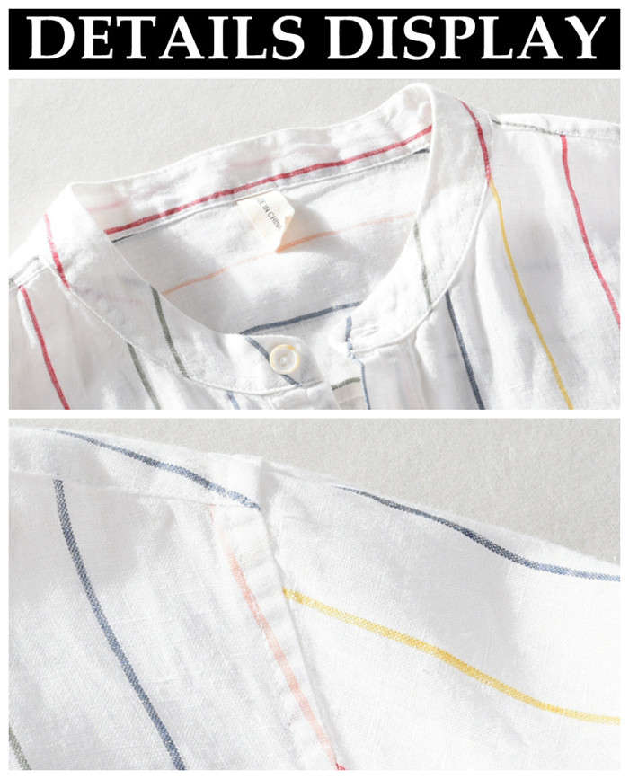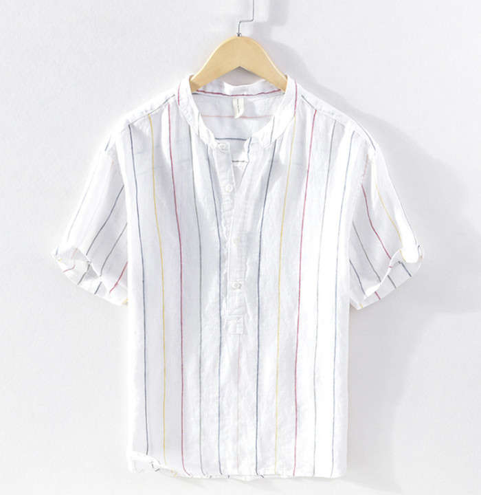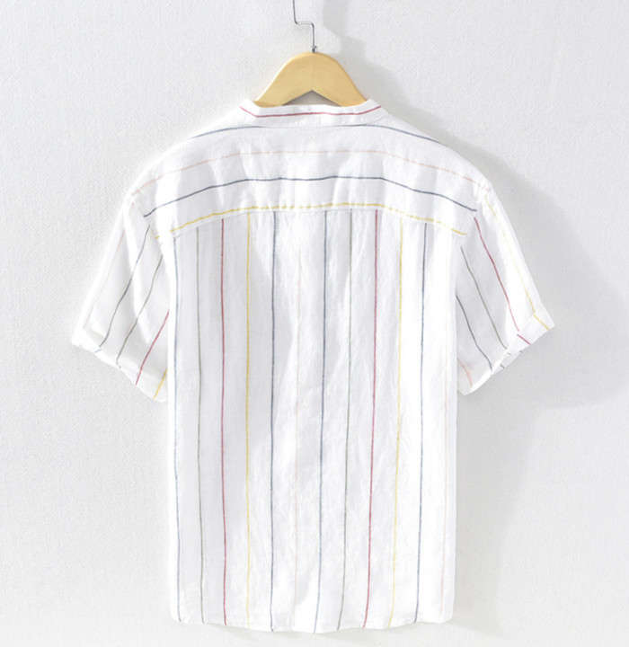 綿麻 ストライプ柄 半袖Tシャツ 立ち