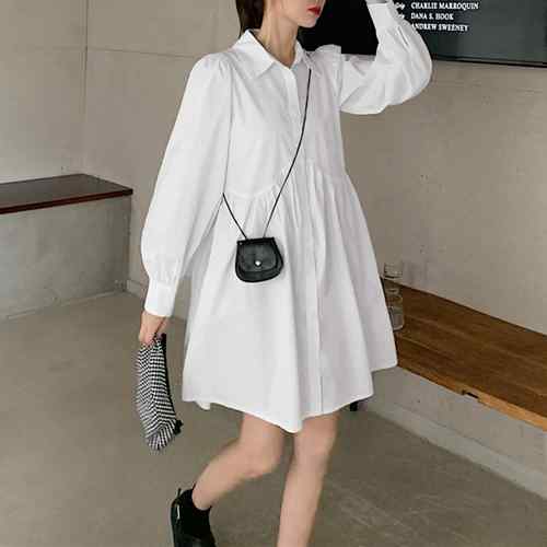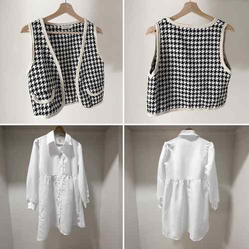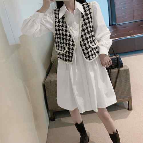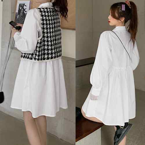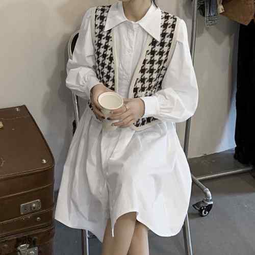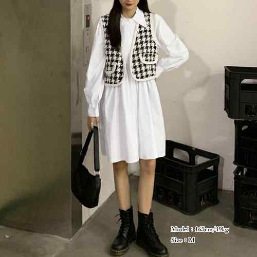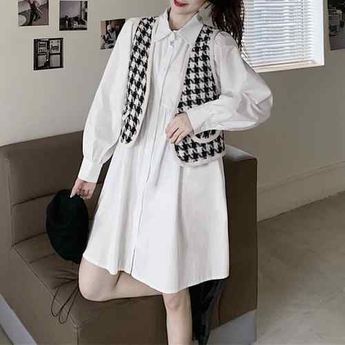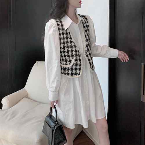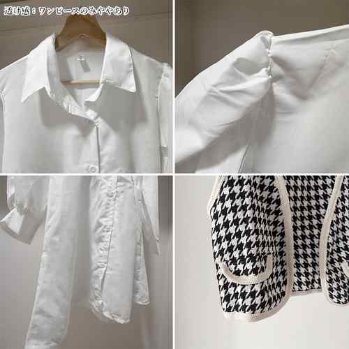 シャツワンピース 白 長袖 千鳥柄ベス